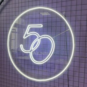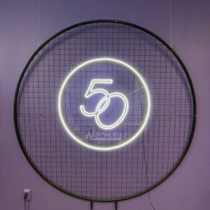 ???? أرقام نيون أنيقة “50” بدائرة — هذا عنصر ديكور راقي يضيف لمكانك ستايل وجو حلو. مناسبة كلش للاحتفالات، الحفلات الخاصة أو واجهات الكافيهات. التصميم الدائري يبين الأناقة والكمال مال التركيبة.