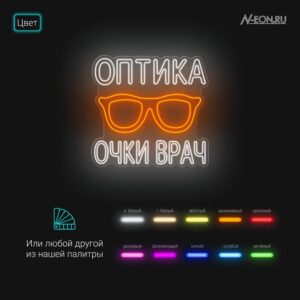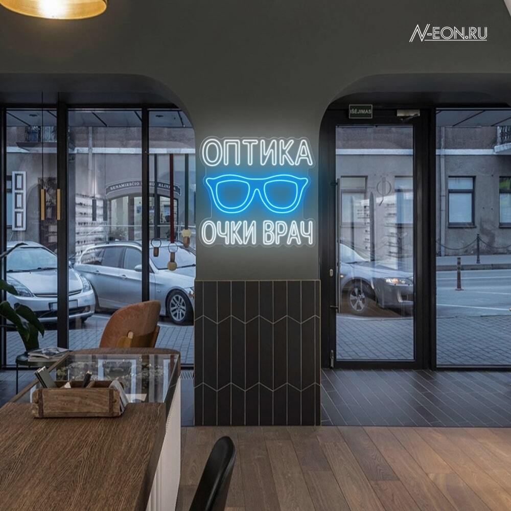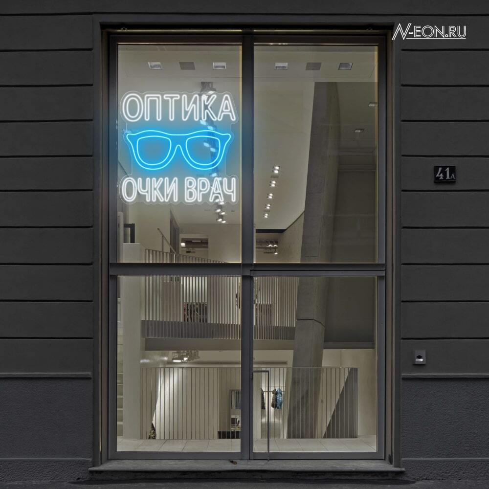 لافتة نيون ضوّاية تستقبل الزباين بصالون نظارات ستايل وبي يشتغل دكتور عيون