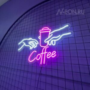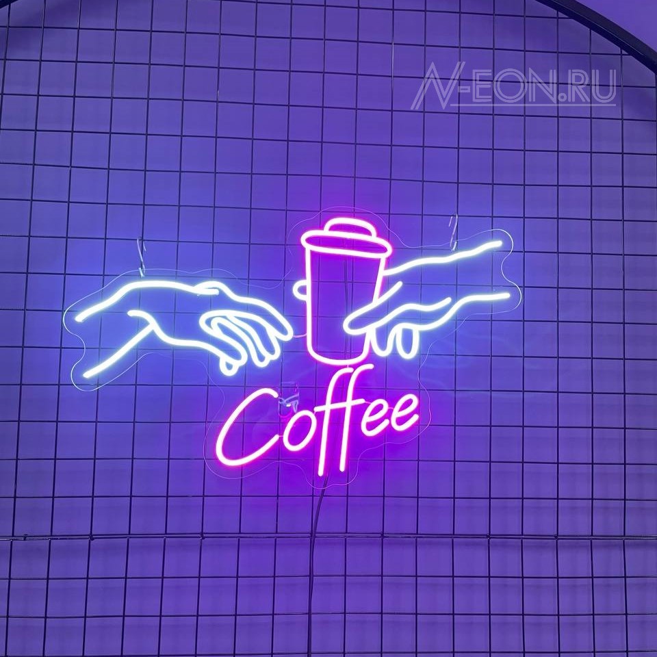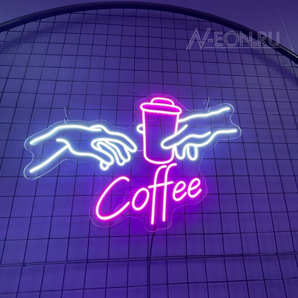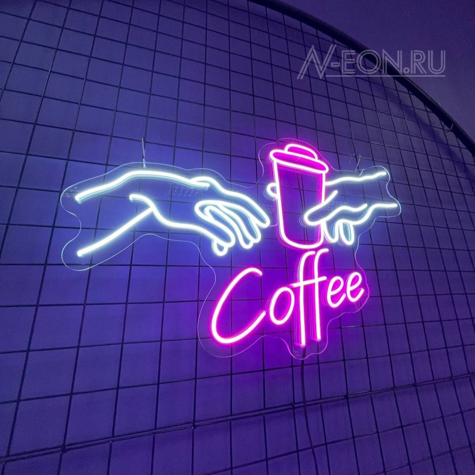 هاي لافتة النيون اللي بيها رسم إيدين آدم لازمة كوب گهوة، راح تسوي جو دافي وحلو بمكانكم، وتدعو الزبائن يستمتعون بكوب گهوة عطرية.