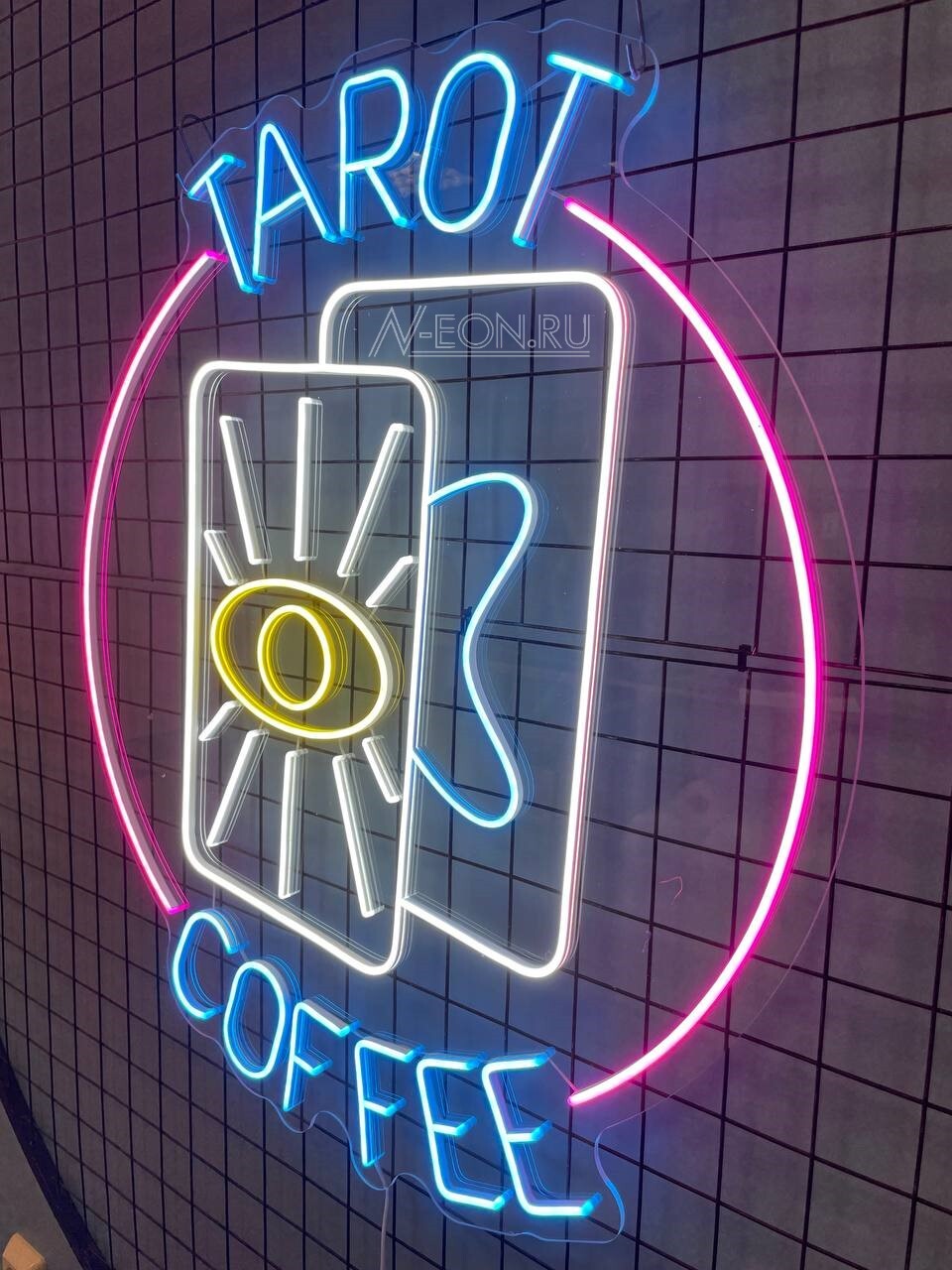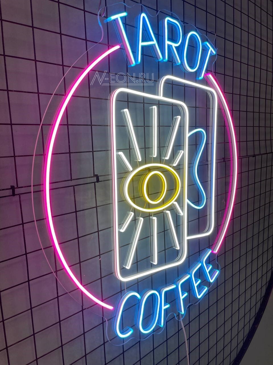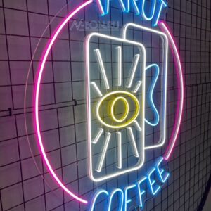 ضوء النيون الساطع، بس مو مزعج، راح يخلي قهوتك أو مكانك مميز وينطبع بالذاكرة، ويجذب انتباه اللي يحبون القهوة الزينة ويقدرون الجماليات الغامضة.