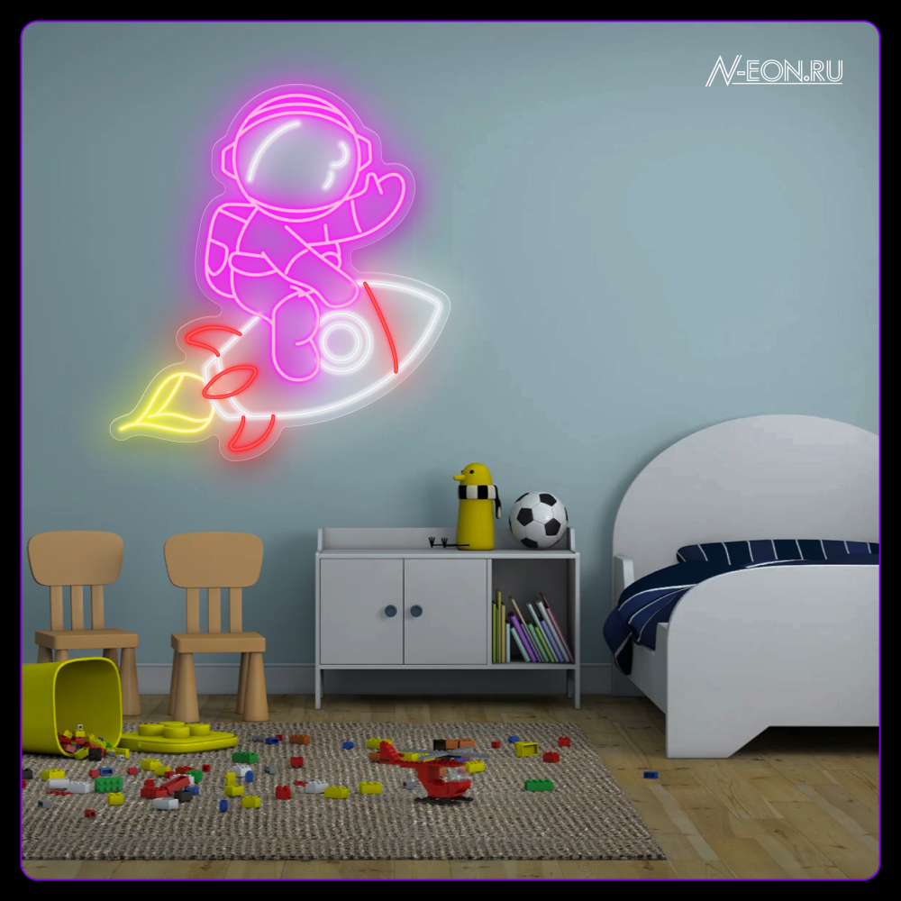 اغزو الفضاء ويا لافتة النيون ????! رائد الفضاء بالصاروخ راح يلهم الحالمين الصغار ويزين الغرفة بألوان زاهية. سوّي جو مغامرات وخيال.