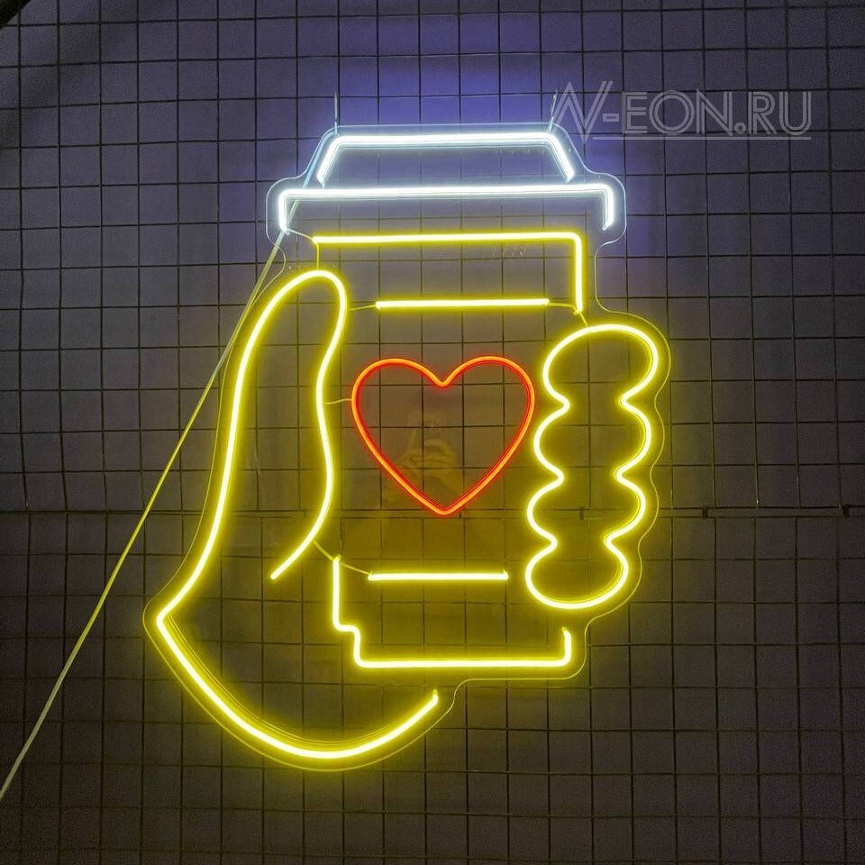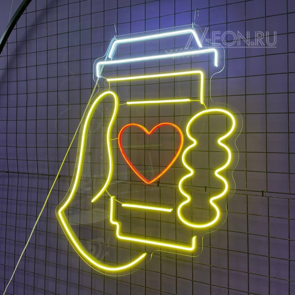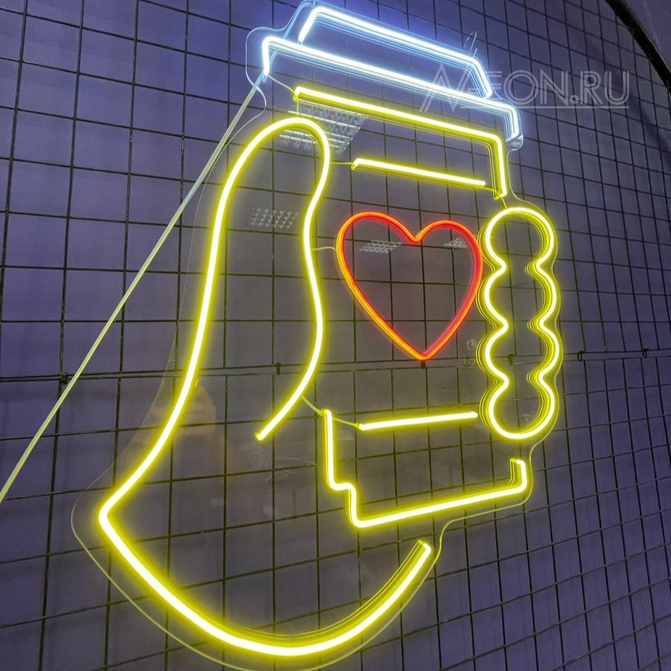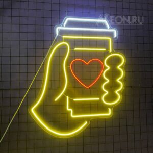 لافتة نيون بيها صورة إيد لازمة كوب قهوة، راح تسوي جو دافي وحلو، وتدعي الزبائن يستمتعون بكوب قهوة طيبة بمكانكم المريح