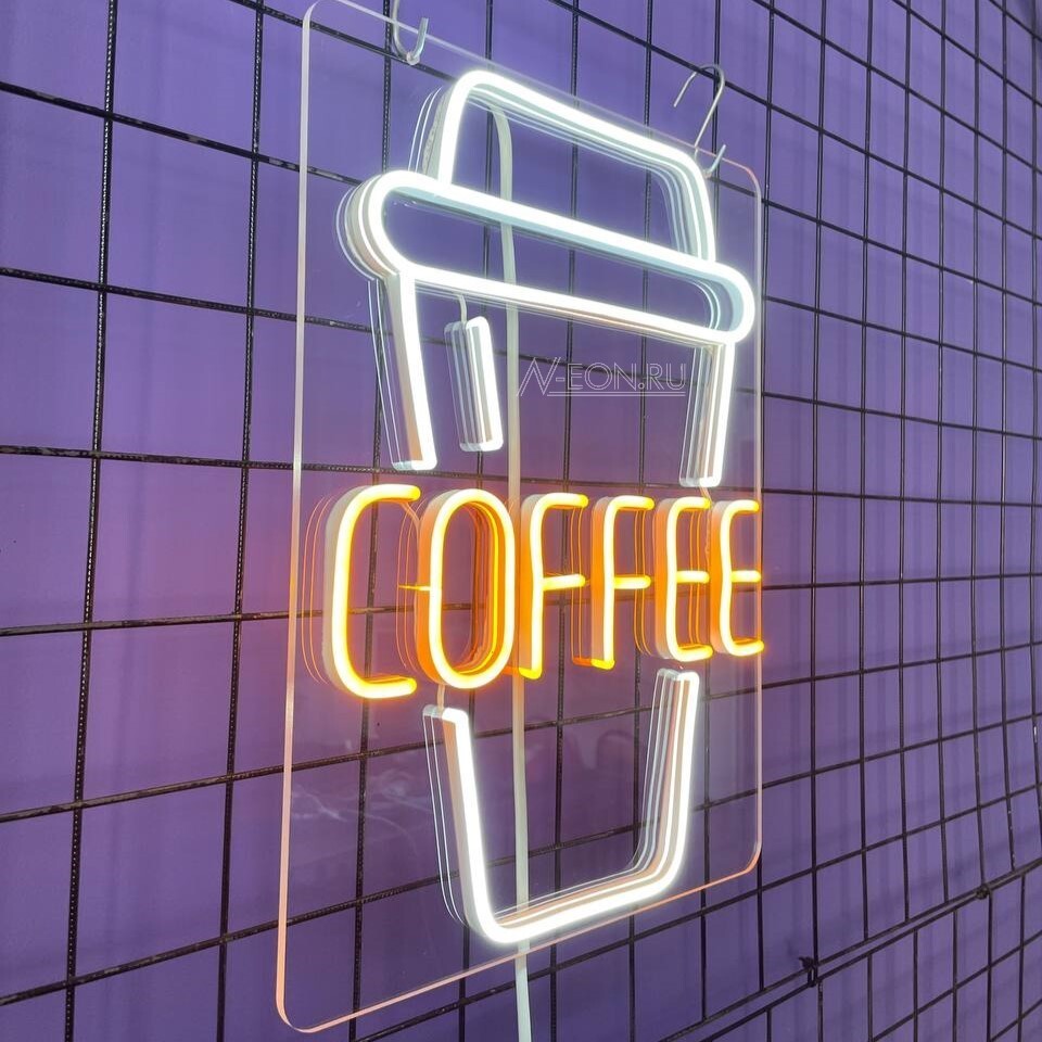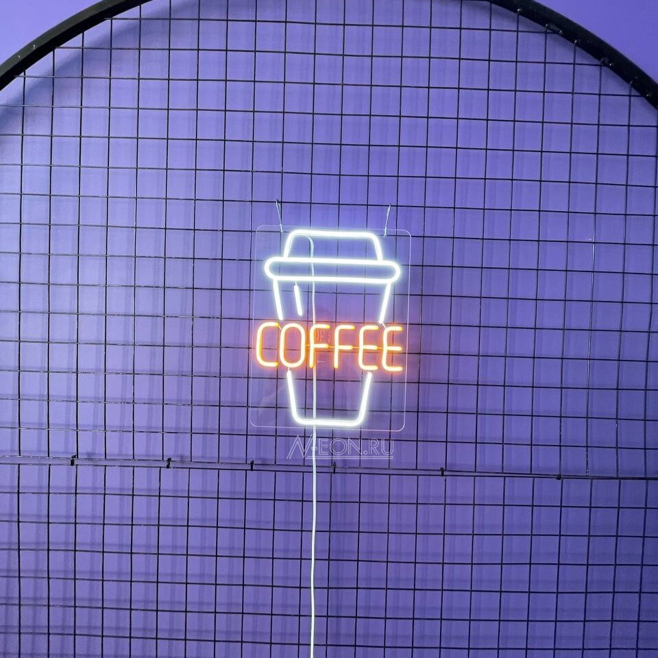 صورة كوب ورقي أنيق وعليه كتابة “Coffee”، مسوييها بضوء نيون ساطع، بسرعة تربطها بالراحة والتنقل.