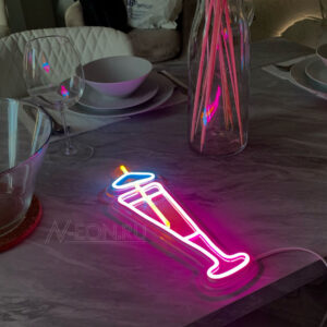 لافتة نيون تخبل ومضيئة، مصنوعة من نيون وردي، أزرق وبرتقالي متناسق، تكدر تختار إضاءة النيون اللي تعجبك، وهمين تكدر تضيف ديمر (مخفت إضاءة) حتى تتحكم بشدة إضاءتها وبيها أوضاع للوميض، تتركب عالجدار أو تتعلك.