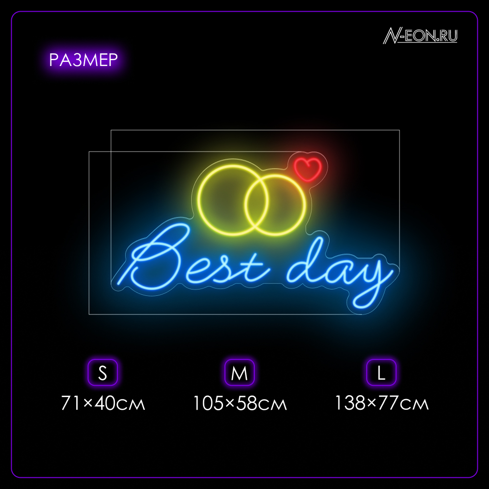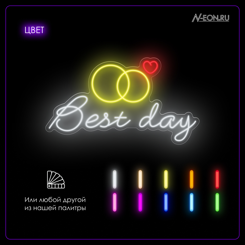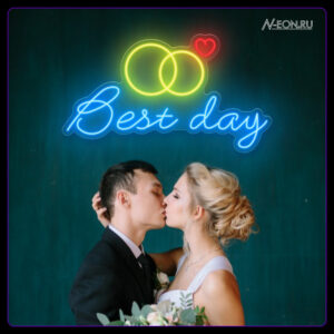 “Best day” – هاي لافتة نيون مثالية لديكور العرس. خطها الحلو والإضاءة الهادية مالتها راح تبرز أهمية يومكم المميز. مناسبة لأماكن التصوير، قاعات الحفلات والسهرات الرومانسية.