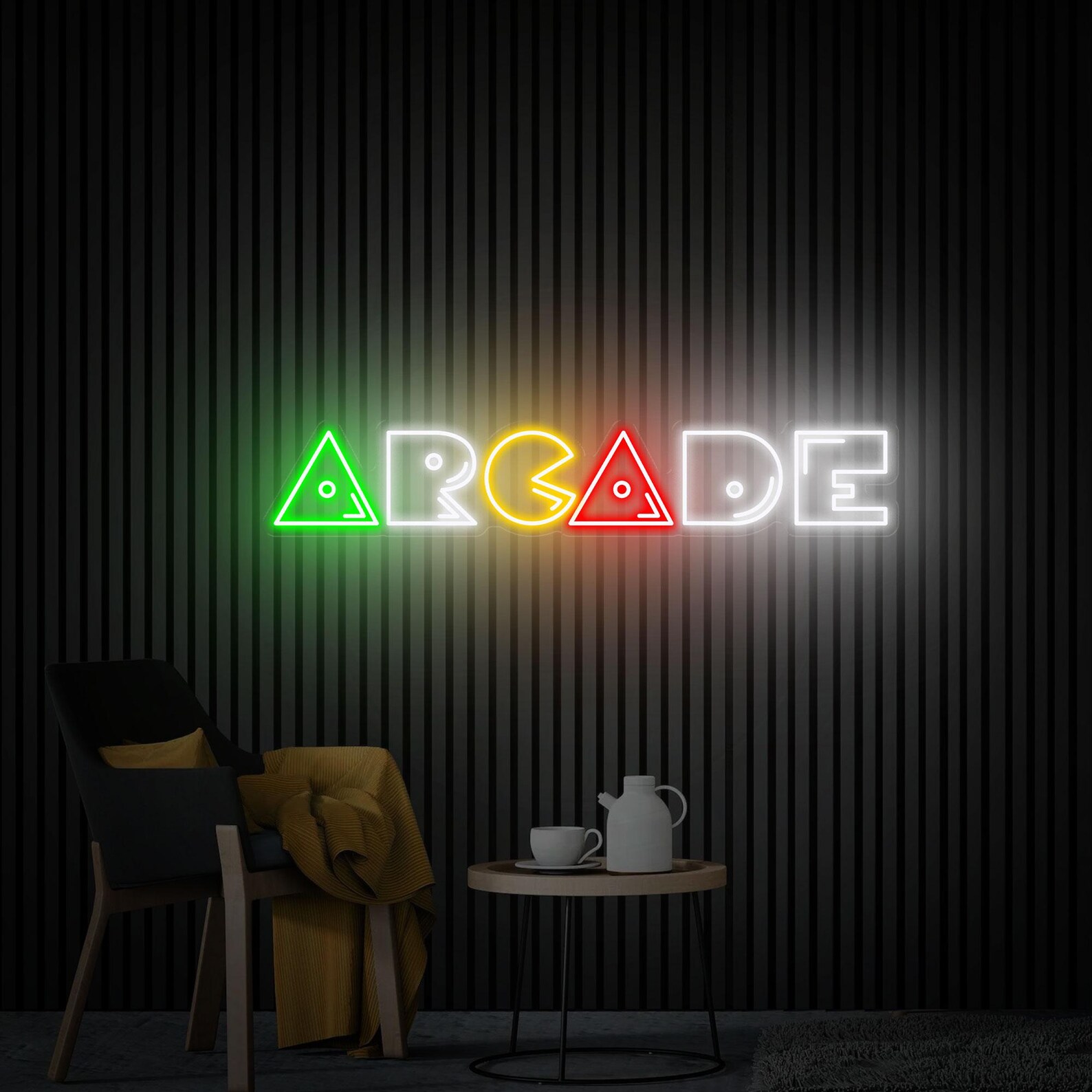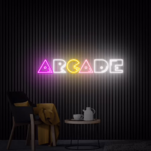 لوحة نيون أركيد هندسية هي قطعة ديكور ضوئي أنيقة مستوحاة من عالم الألعاب الكلاسيكية بأسلوب هندسي حديث. يظهر التصميم كلمة Arcade مكوّنة من أشكال هندسية مضيئة متعددة الألوان، مما يمنح المكان طابعًا عصريًا ومميزًا.