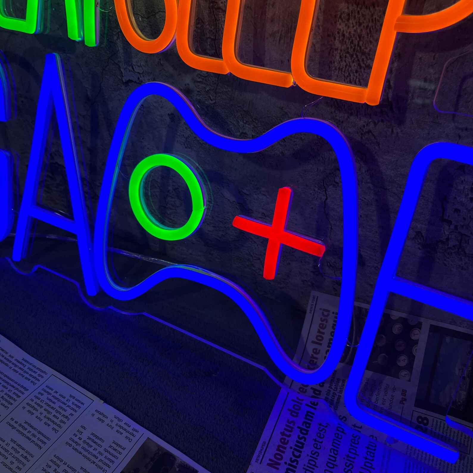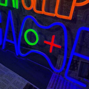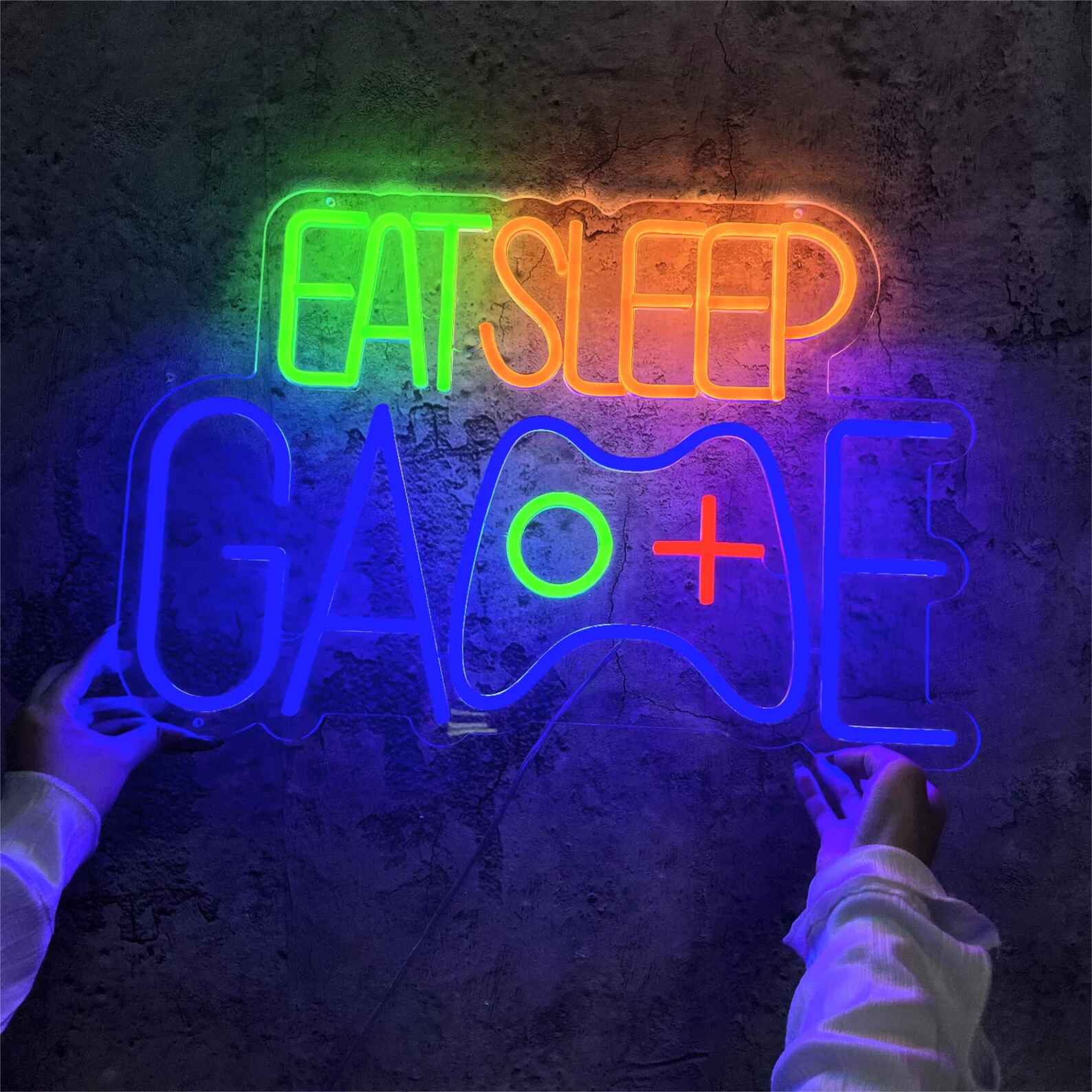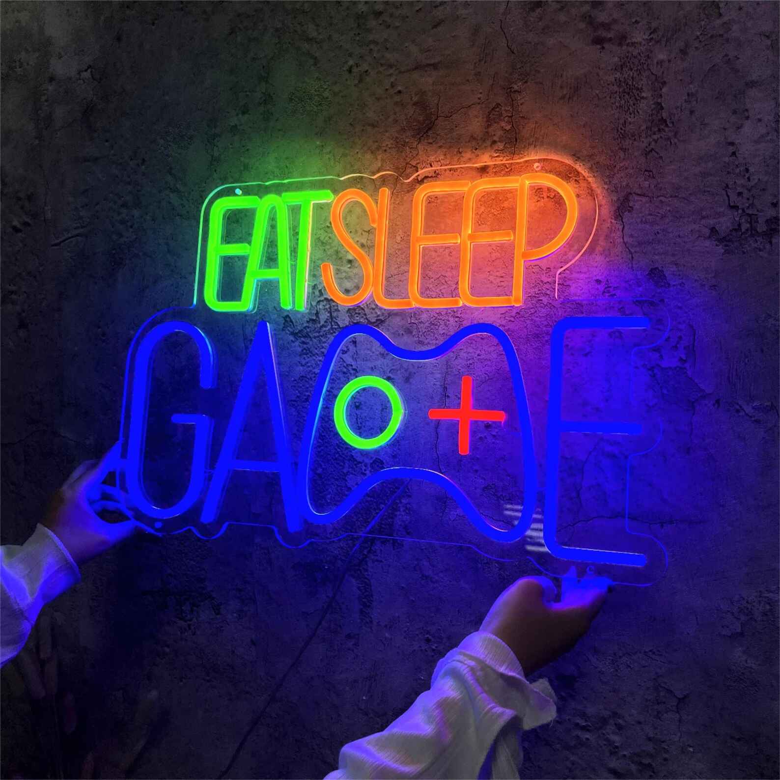 لوحة نيون إيت سليب جيم هي قطعة ديكور ضوئي مرحة تعكس أسلوب حياة عشاق الألعاب. يظهر التصميم عبارة Eat Sleep Game مع يد تحكم مضيئة في المنتصف، مما يمنح المكان طابعًا حيويًا وممتعًا.