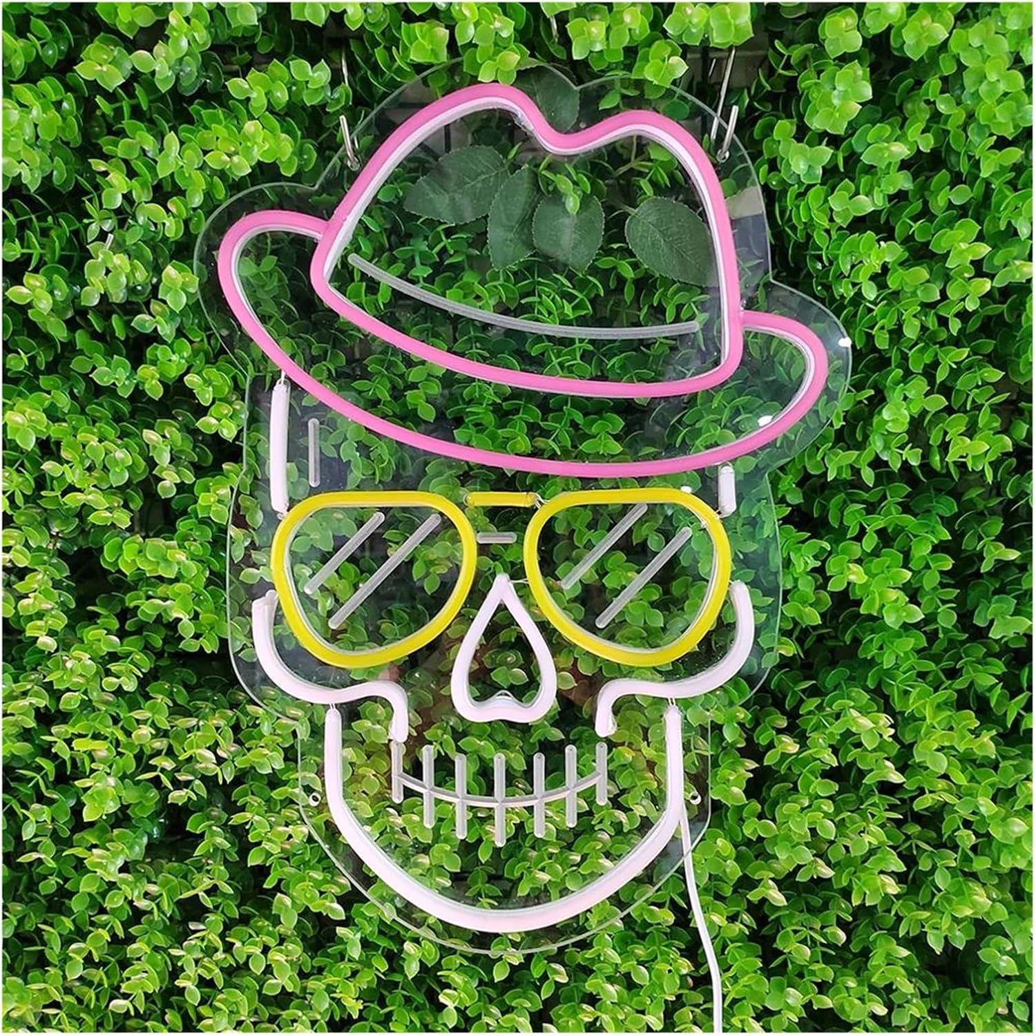 تصميم هذه الجمجمة الأنيقة بقبعة ونظارات شمسية مضيئة بألوان زاهية مثل الوردي والأصفر يضفي روحًا متمردة ومحبوبة في نفس الوقت.
