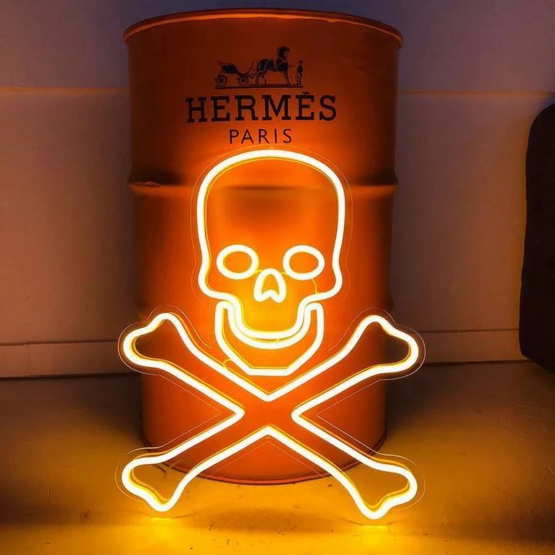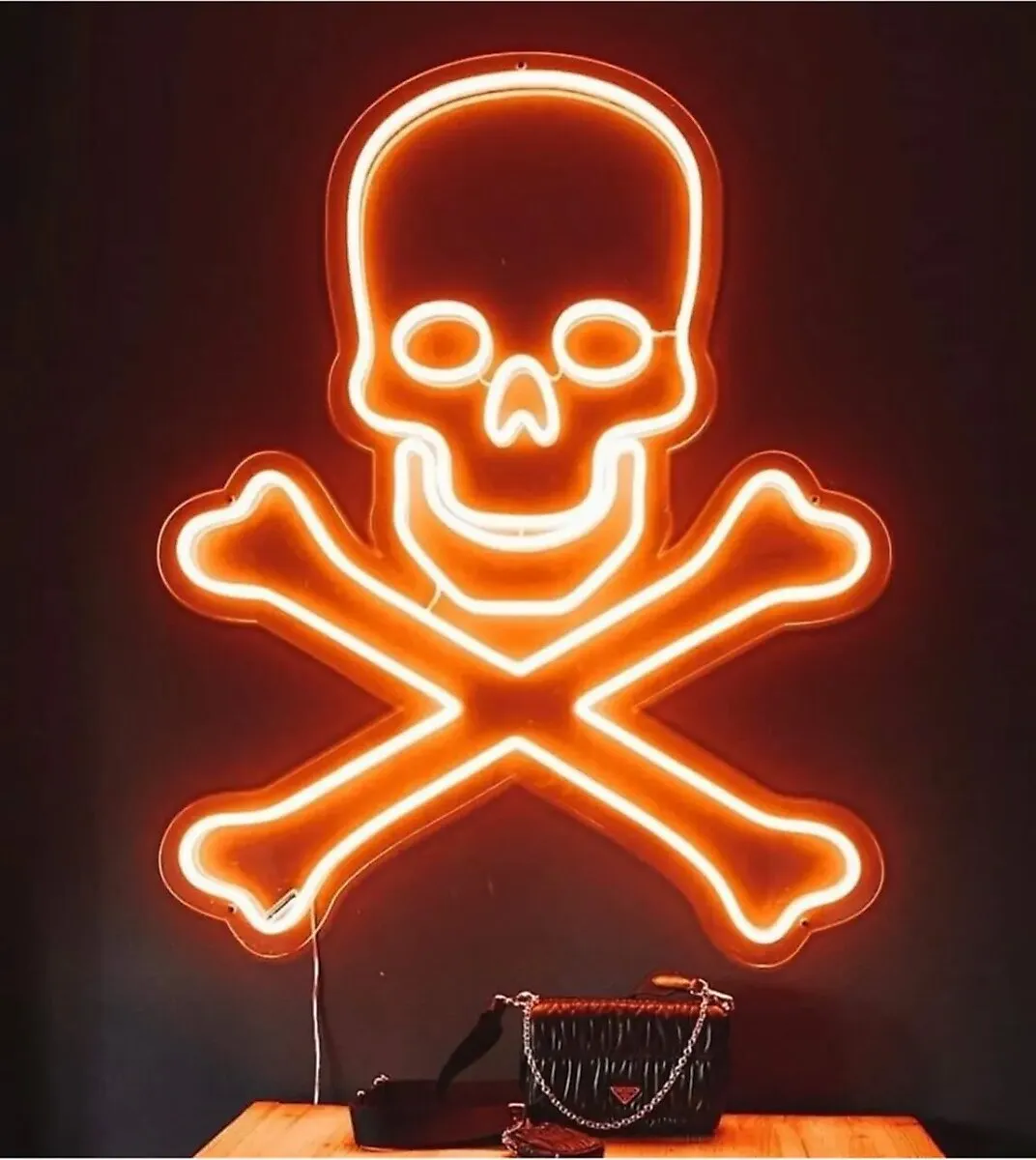 لوحة نيون قوية ومتمردة بتصميم الجمجمة والعظمتين، تضيء باللون البرتقالي الناري.