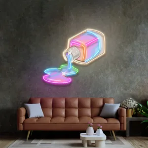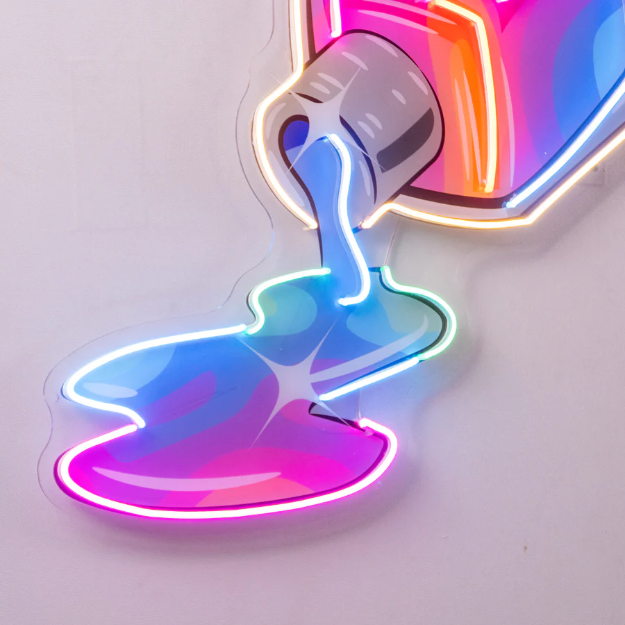لوحة نيون انسكاب الطلاء هي قطعة ديكور ضوئي فنية تعبر عن الإبداع والحرية الفنية. يظهر التصميم علبة طلاء مقلوبة ينسكب منها الطلاء بألوان نيون متوهجة، مما يمنح المكان طابعًا فنيًا عصريًا وجذابًا.