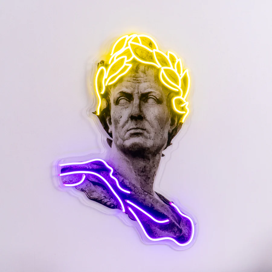 لوحة نيون تمثال قيصر هي قطعة ديكور ضوئي فنية تجمع بين الطابع الكلاسيكي الروماني واللمسة العصرية للنيون. يظهر التصميم رأس تمثال قيصر مع إكليل متوهج بإضاءة صفراء وخط نيون بنفسجي أسفل التمثال، مما يمنح المكان طابعًا فنيًا راقيًا وحديثًا في نفس الوقت.