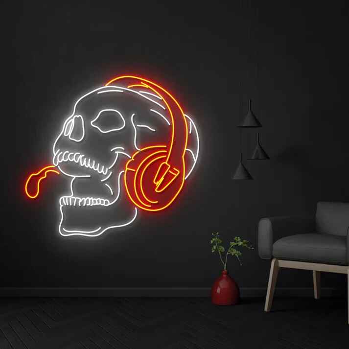 لوحة نيون جمجمة سماعة هي قطعة ديكور ضوئي جريئة مستوحاة من ثقافة الألعاب والموسيقى الإلكترونية. يظهر التصميم جمجمة بإضاءة نيون بيضاء مع سماعة رأس متوهجة باللون الأحمر والبرتقالي، مما يمنح المكان طابعًا قويًا وعصريًا.