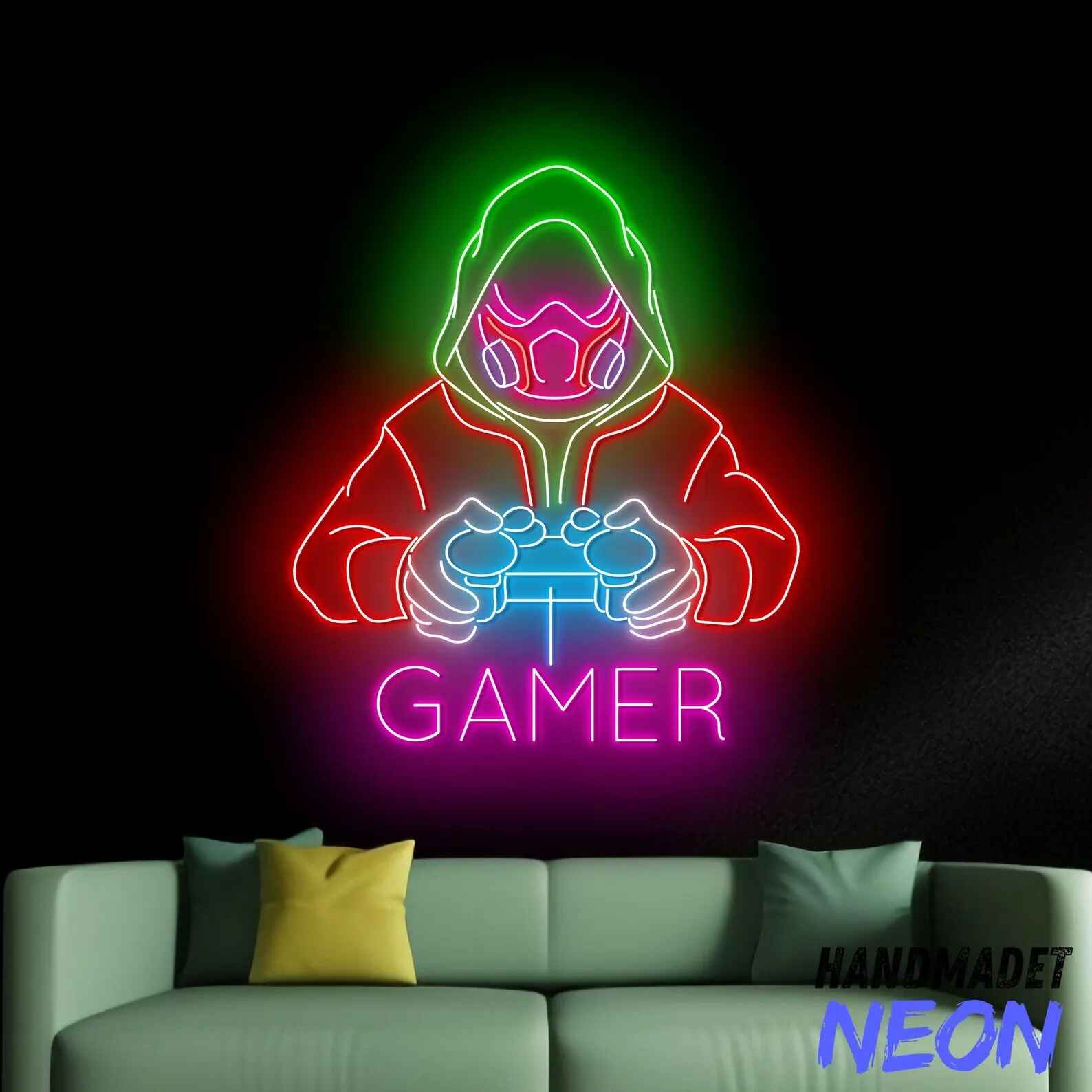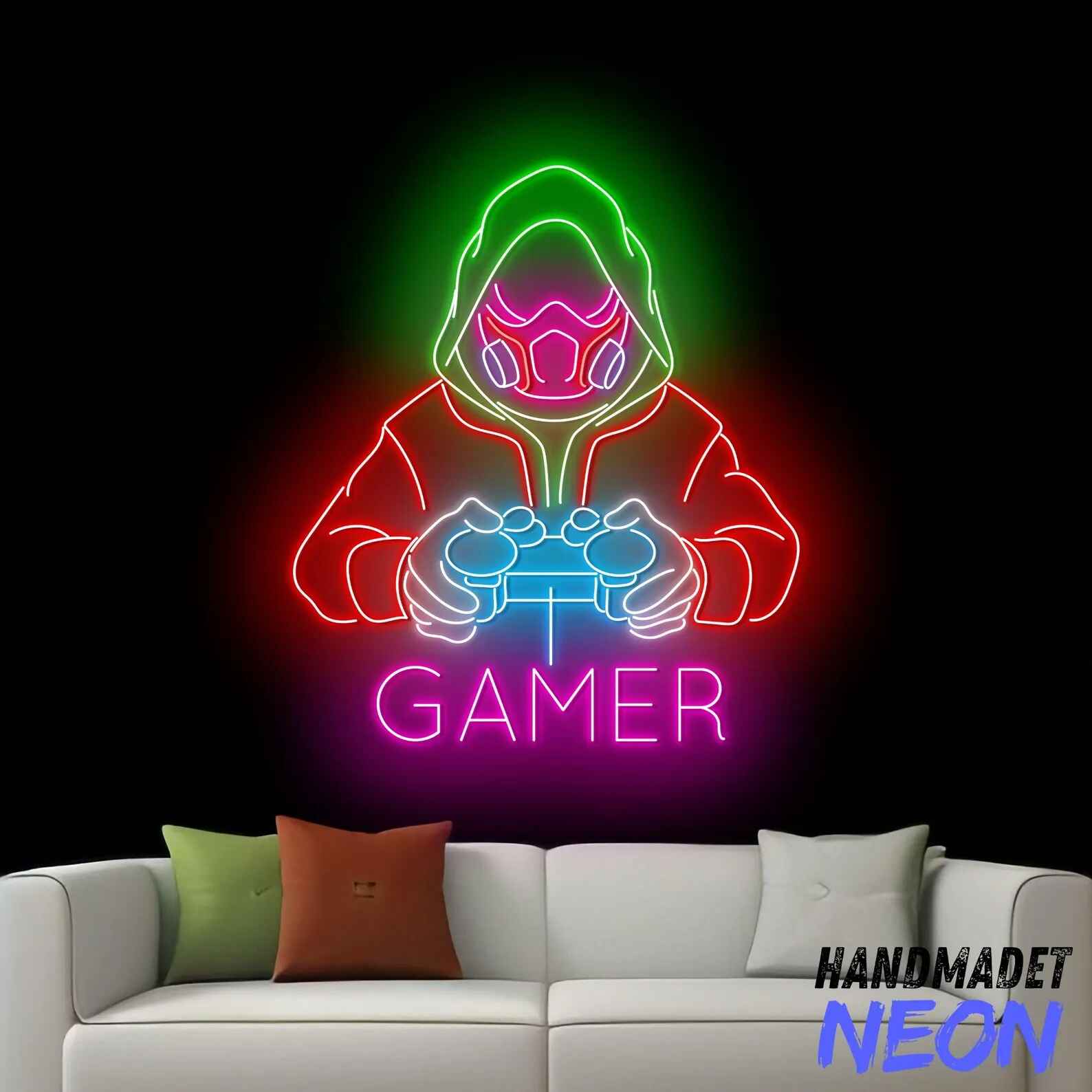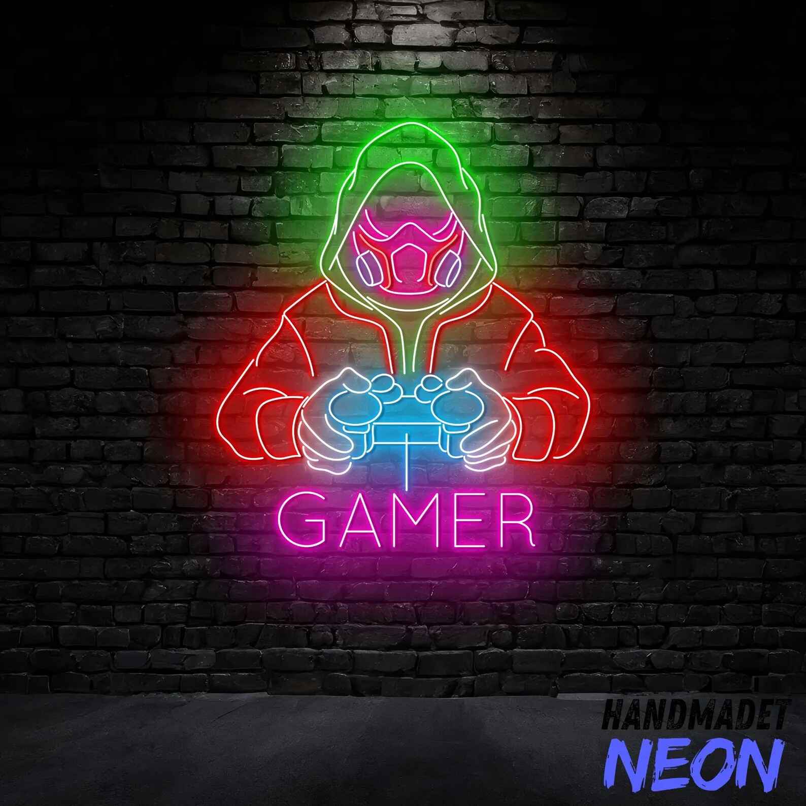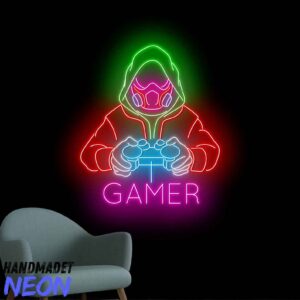 لوحة نيون جيمر مقنع هي قطعة ديكور ضوئي مستوحاة من عالم الألعاب الإلكترونية الاحترافية. يظهر التصميم شخصية جيمر يرتدي غطاء رأس وقناع ويمسك يد تحكم مضيئة مع كلمة Gamer أسفلها، مما يمنح المكان طابعًا احترافيًا وغامضًا في نفس الوقت.