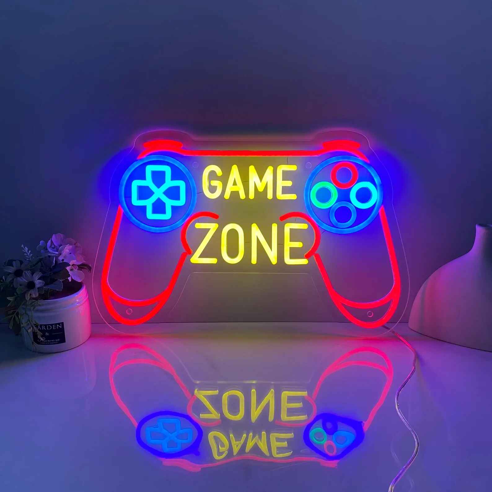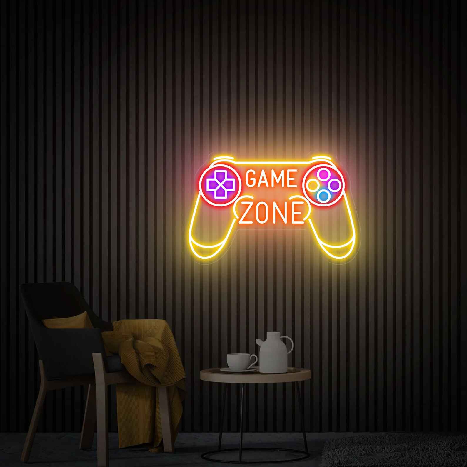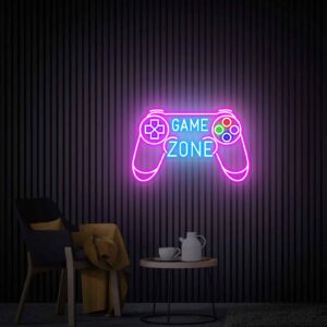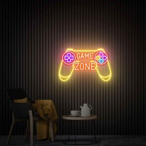لوحة نيون جيم زون هي قطعة ديكور ضوئي مميزة تجمع بين يد التحكم وكلمة Game Zone بإضاءة نيون ملونة، مما يمنح المكان طابعًا حيويًا ومليئًا بالطاقة.