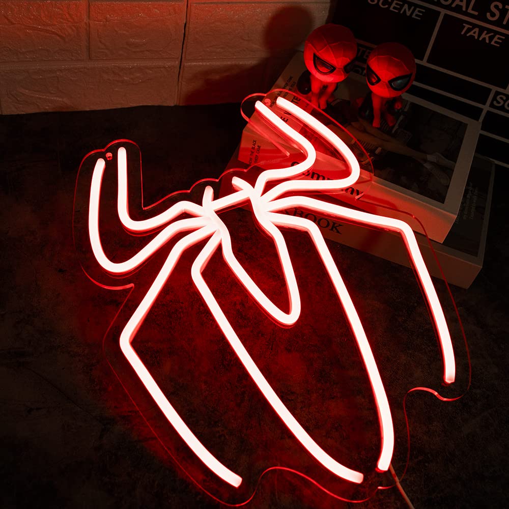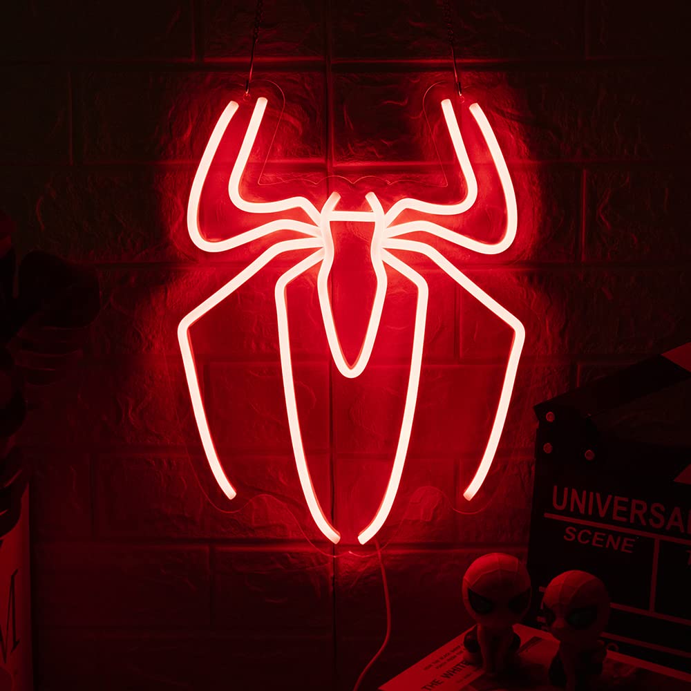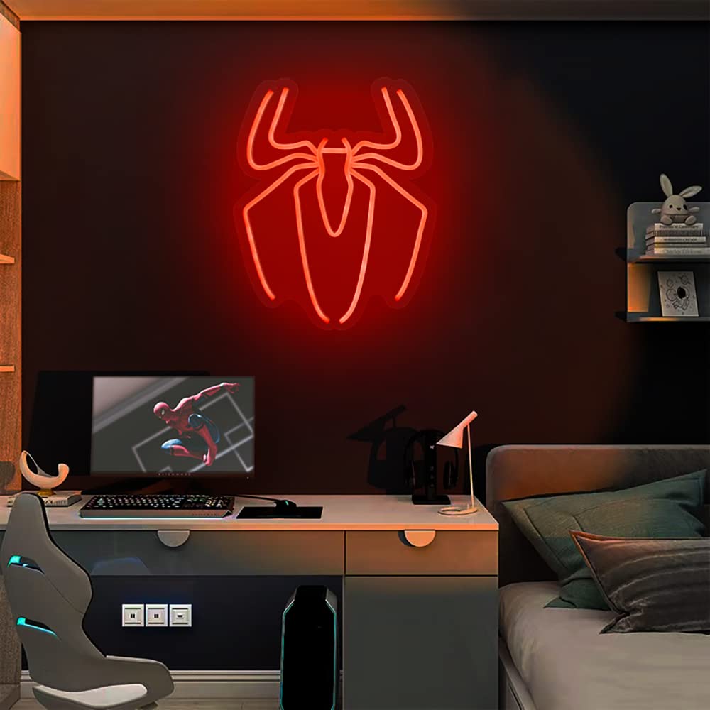 لوحة نيون مذهلة برمز الرجل العنكبوت الأحمر، مثالية لعشاق مارفل وأجواء الأبطال الخارقين.