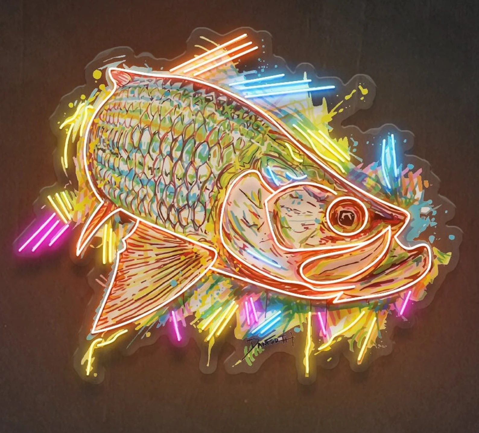لوحة نيون بتصميم سمكة بأسلوب فني مع رشات ألوان مضيئة بإضاءة LED جذابة.