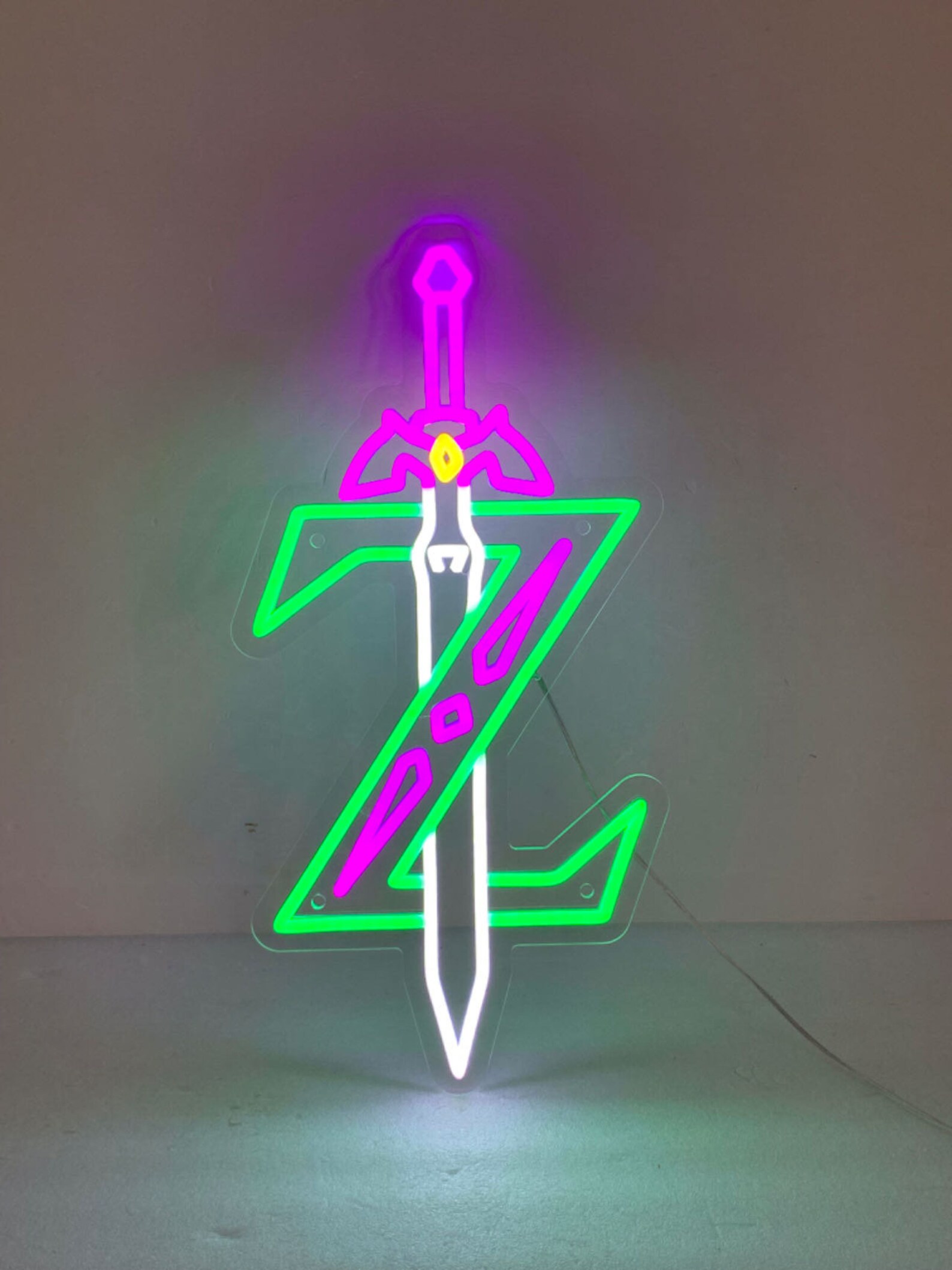لوحة نيون بتصميم سيف أسطوري داخل حرف Z بإضاءة LED ملونة وعصرية.