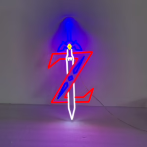 لوحة نيون سيف أسطوري هي قطعة ديكور ضوئي مستوحاة من عالم الألعاب الخيالية والمغامرات. يظهر التصميم سيف مضيء في المنتصف داخل حرف Z متوهج، مما يمنح المكان طابعًا بطوليًا وأسطوريًا.