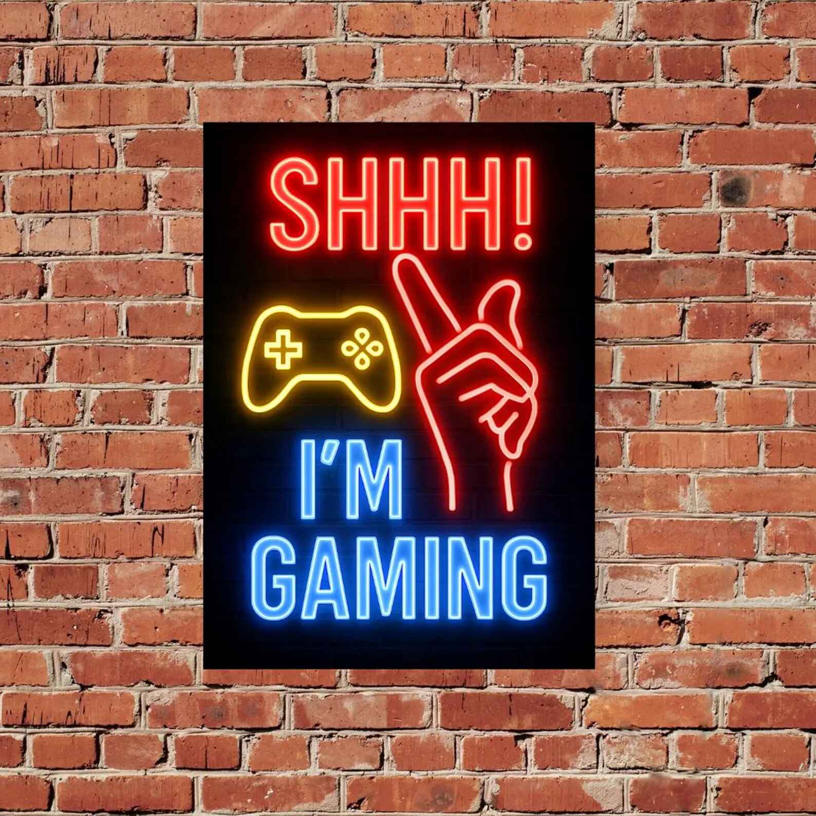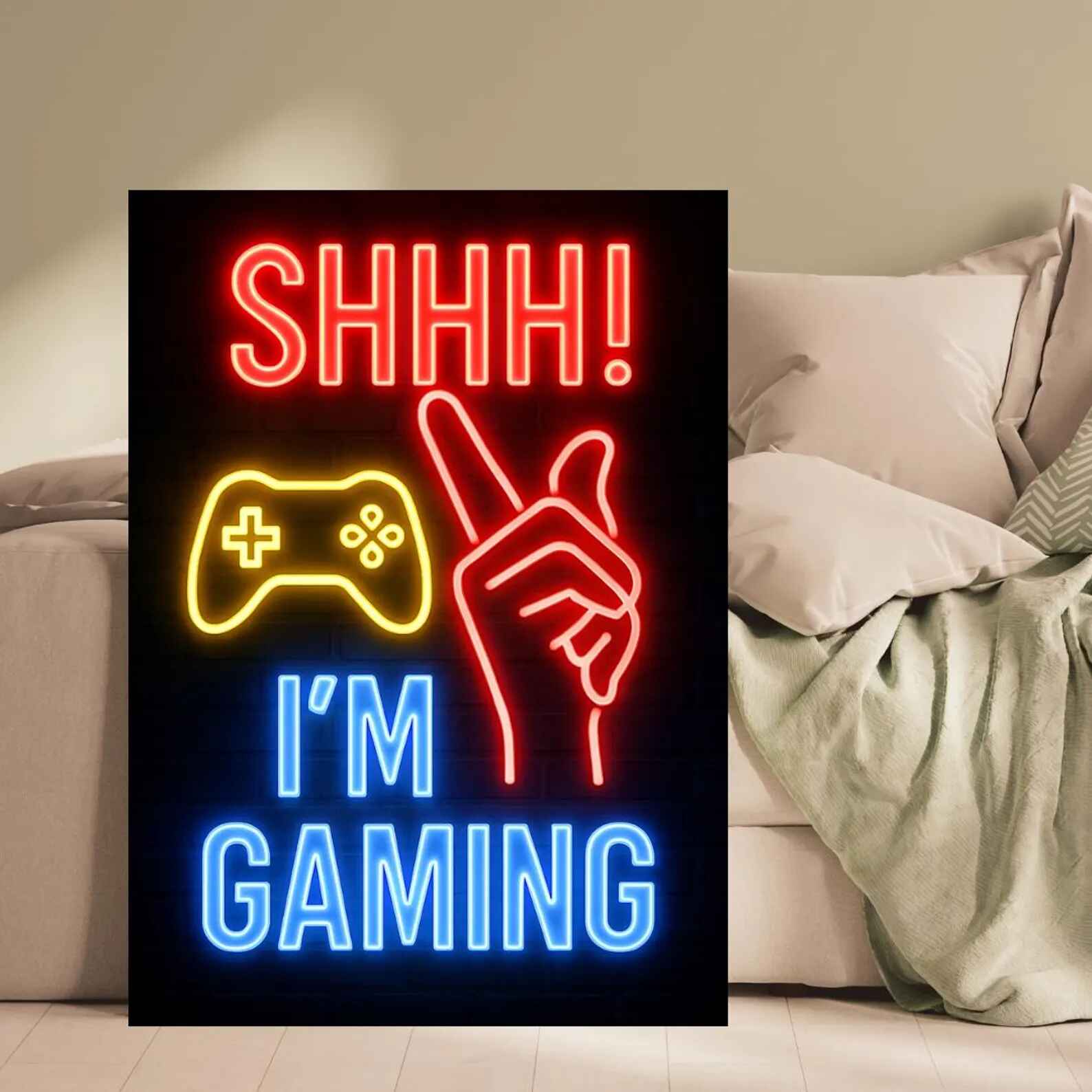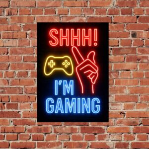 لوحة نيون بتصميم عبارة Shhh! I’m Gaming مع يد تشير للصمت ويد تحكم مضيئة.