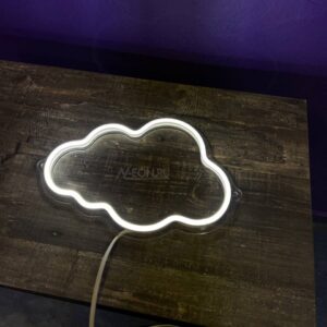 خفة وراحة ببيتك! لافتة النيون “غيمة” – هاي إضاءة مميزة لديكور البيت، تسوي جو هادي ومرتاح. لافتة نيون صغيرة بيها رسم غيمة تصير إضاءة ليلية مثالية لغرفة النوم أو غرفة الجهال. نيون LED مرن وبجودة عالية ينطي إضاءة ناعمة. اللافتة موجودة – اشتريها هسه!
