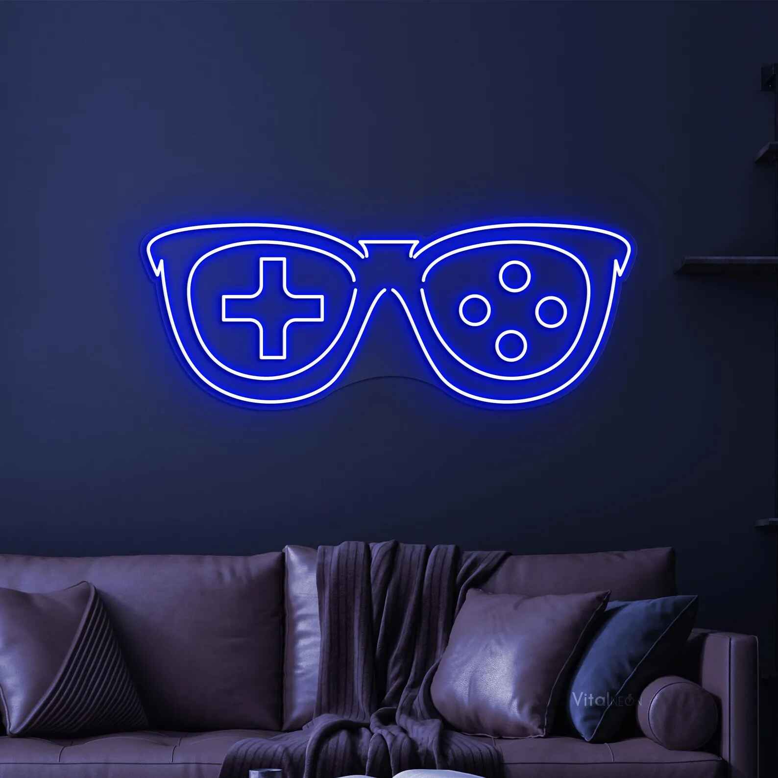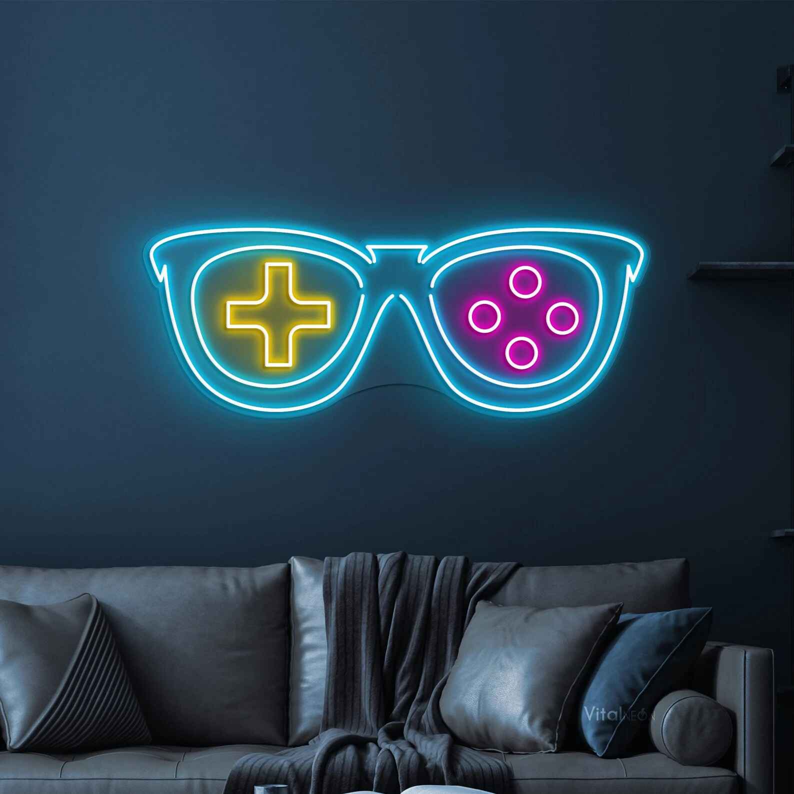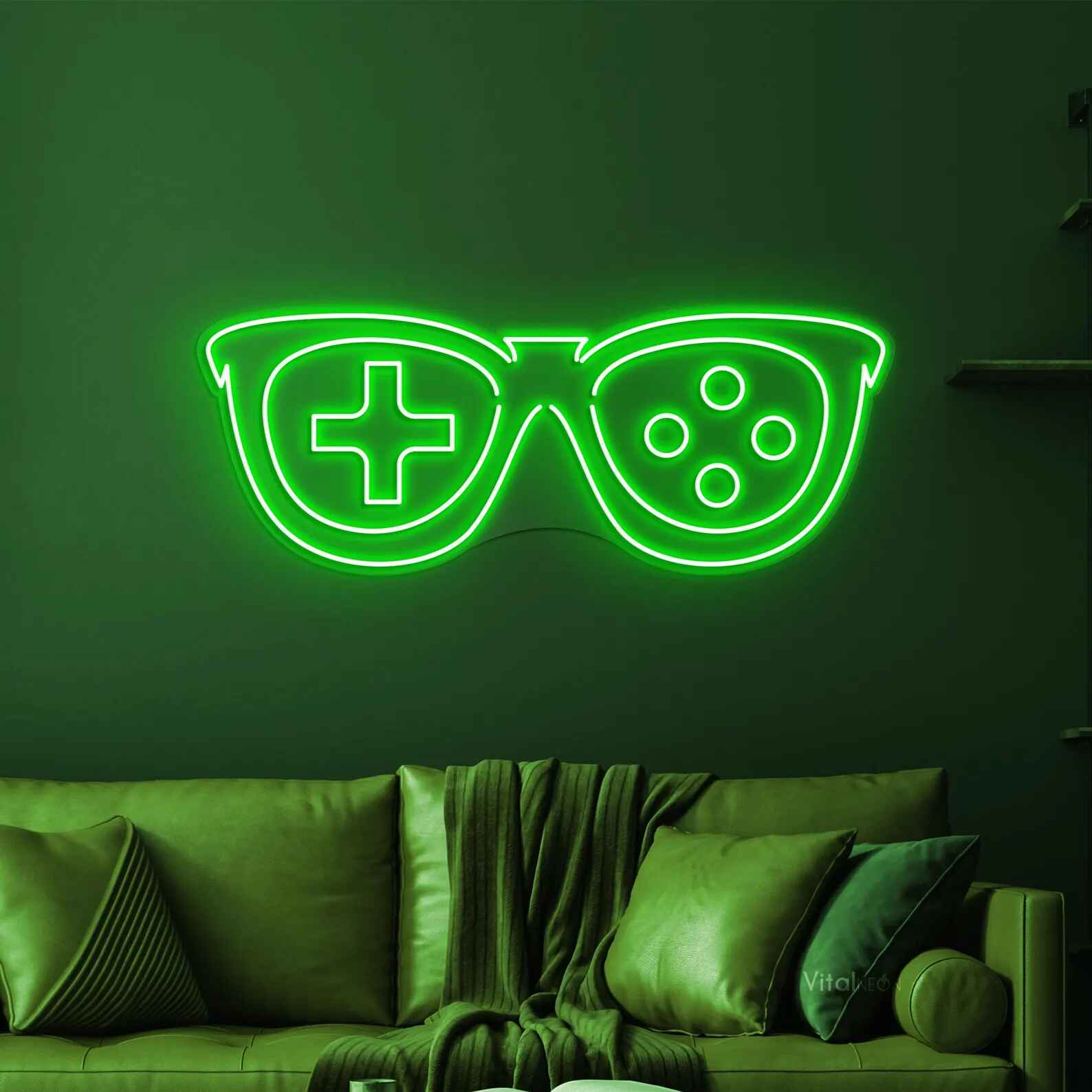 لوحة نيون نظارات جيمر هي قطعة ديكور ضوئي مرحة ومبتكرة مستوحاة من عالم الألعاب الرقمية. يظهر التصميم نظارات بإطار نيون أخضر مع رموز أزرار التحكم داخل العدسات، مما يمنح المكان طابعًا عصريًا وممتعًا.