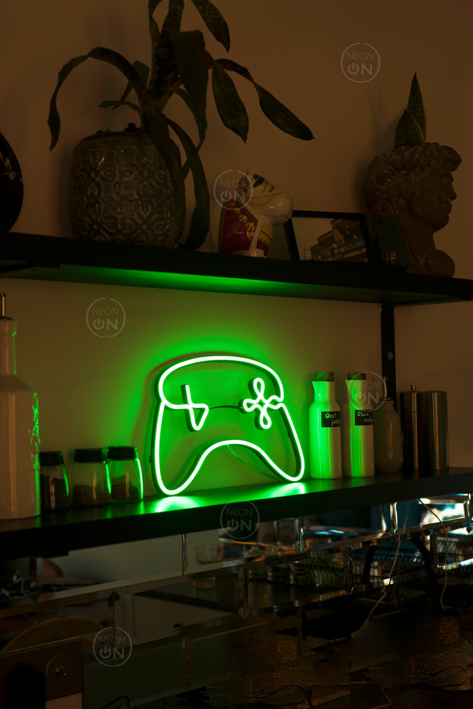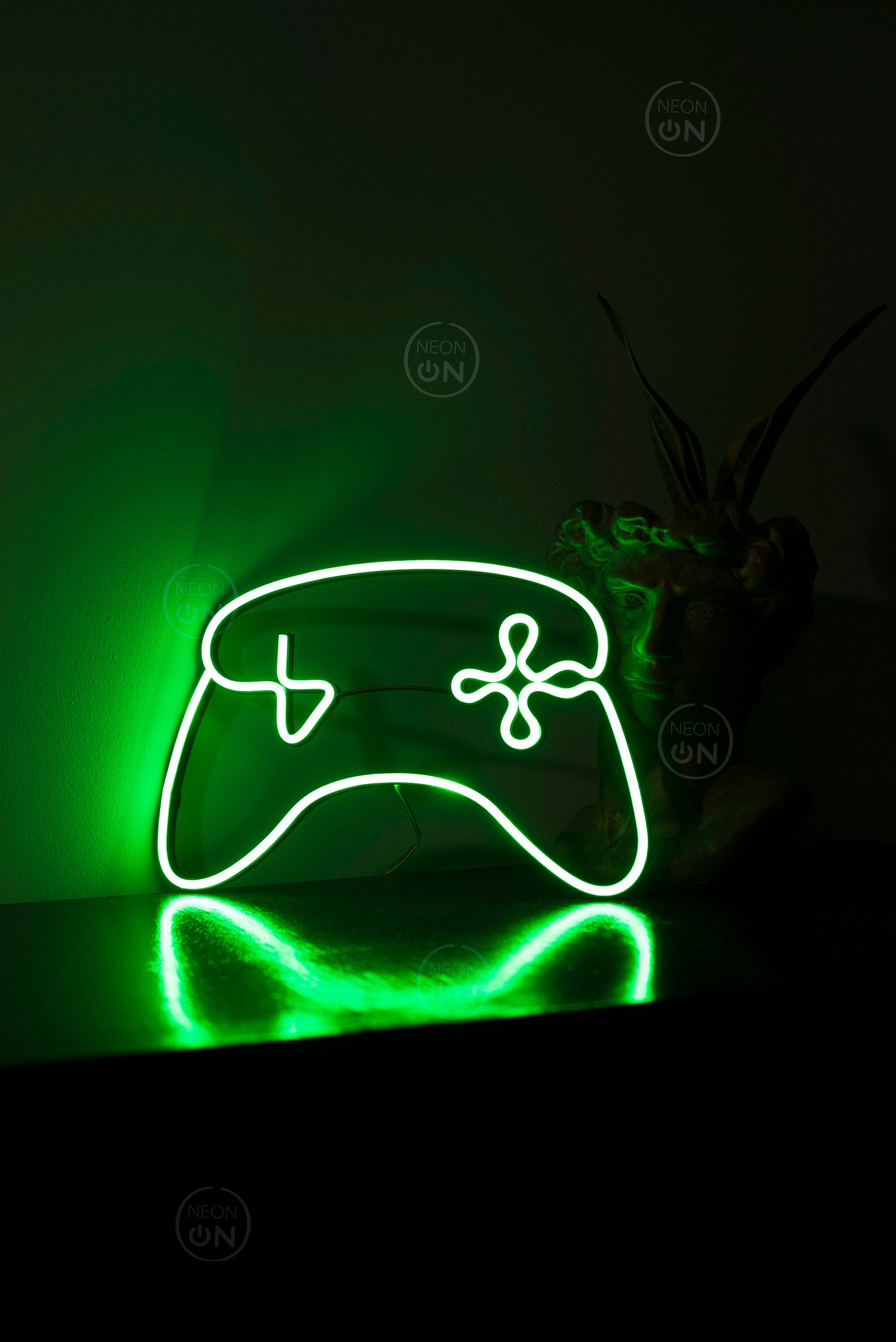 لوحة يد تحكم نيون أخضر هي واحدة من أكثر القطع المميزة لعشاق الألعاب، مصنوعة يدويًا بجودة عالية ومثبتة على لوح أكريليك شفاف، مع شريط نيون LED آمن وموفر للطاقة. مثالية لتزيين غرفتك أو مساحة الألعاب الخاصة بك، وتأتي مع ضمان 24 شهرًا، وأسلاك تثبيت، وكفالة كاملة على الشحن.