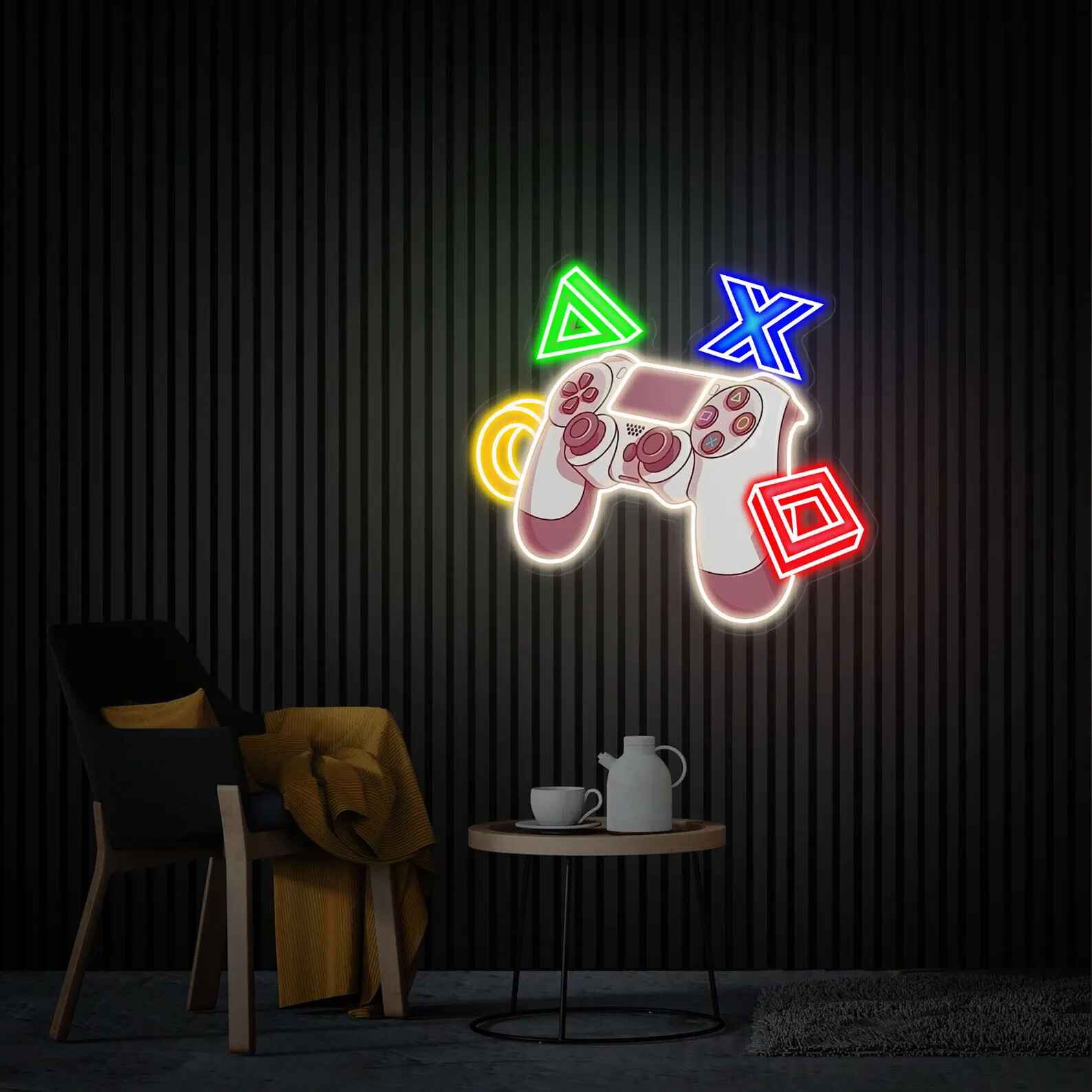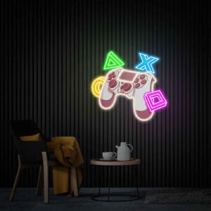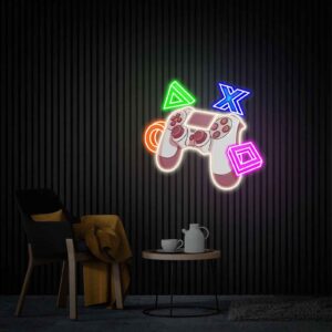 لوحة نيون يد تحكم رموز هي قطعة ديكور ضوئي مرحة مستوحاة من أزرار التحكم الشهيرة في أجهزة الألعاب. يظهر التصميم يد تحكم مضيئة محاطة برموز مثلث، مربع، دائرة، وإكس بإضاءة نيون ملونة، مما يمنح المكان طابعًا ديناميكيًا وممتعًا.