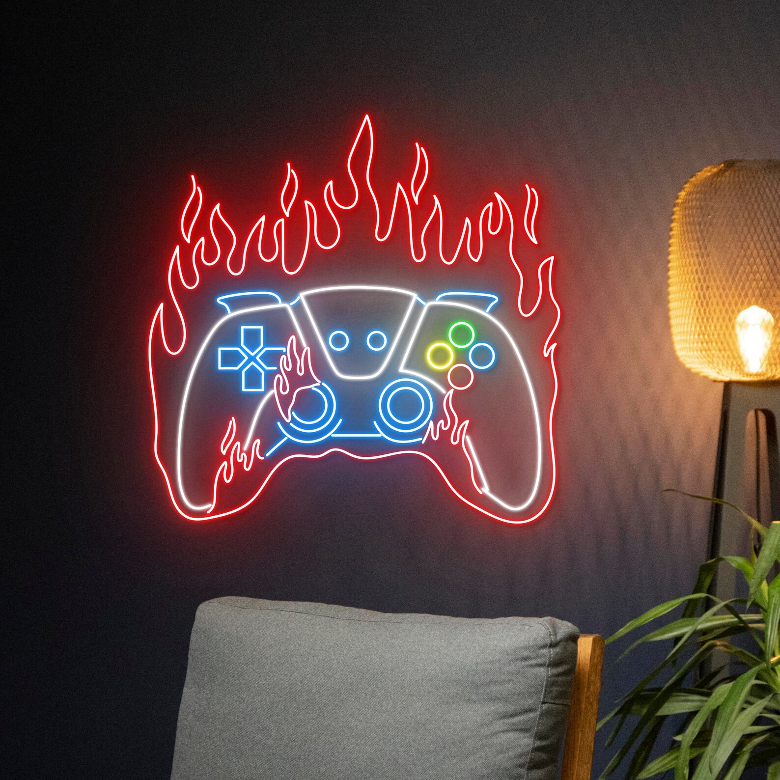 لوحة نيون يد تحكم ملتهبة هي قطعة ديكور ضوئي جريئة مستوحاة من أجواء الحماس والتحدي في عالم الألعاب. يظهر التصميم يد تحكم مضيئة محاطة بلهب ناري متوهج، مما يمنح المكان طابعًا ناريًا وقويًا.