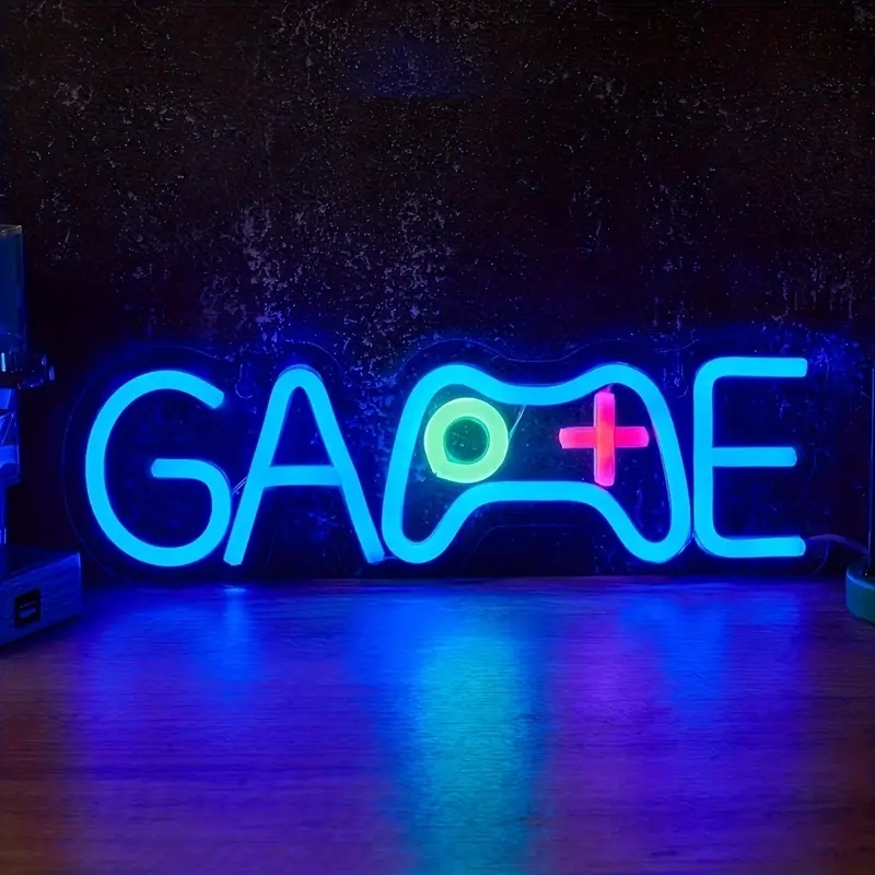 تأتي هذه اللوحة بتصميم عصري يدمج بين الحروف وشكل وحدة تحكم ألعاب، وتُضاء بألوان نيون مبهرة تضيف طاقة وروح للغرفة. مثالية للبث المباشر، غرف الستريمرز، أو كهدية لمحبي الألعاب.