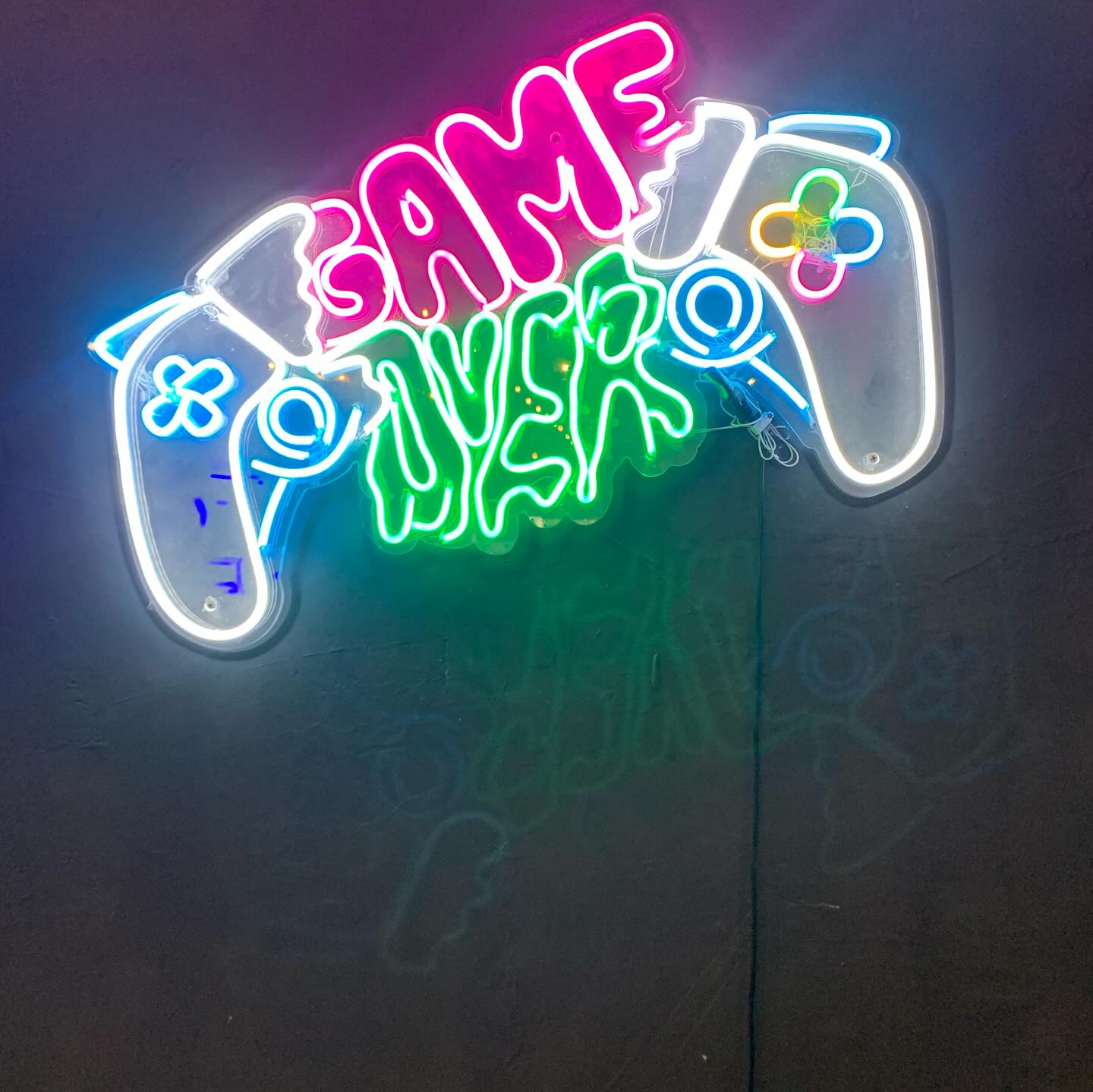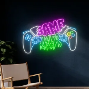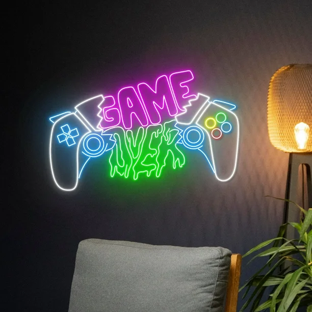 استعد لتضخيم أجواء الألعاب مع لوحة GAME OVER النيونية! تجمع هذه القطعة الفريدة بين تصميم الذراعين وكلمات بألوان وردية وخضراء نيونية ملفتة. مصنوعة يدويًا بجودة عالية من شريط LED نيون مرن، مثبتة على لوح أكريليك شفاف وقوي. تأتي اللوحة مزودة بمحول طاقة وسلك شفاف بطول 3-5 متر، مع ضمان لمدة 24 شهرًا وضمان شحن كامل.