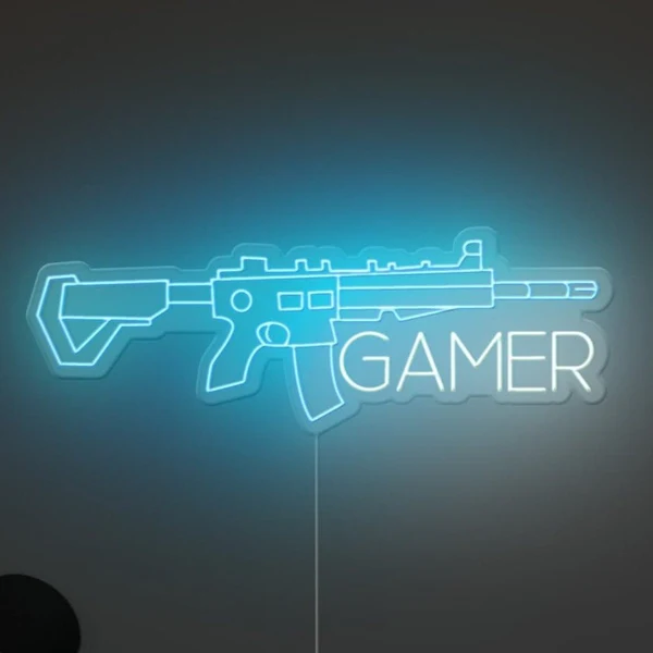 لوحة نيون لمحترفي ألعاب التصويب، تجمع بين شكل السلاح وكلمة GAMER بتوهج أزرق جذاب.