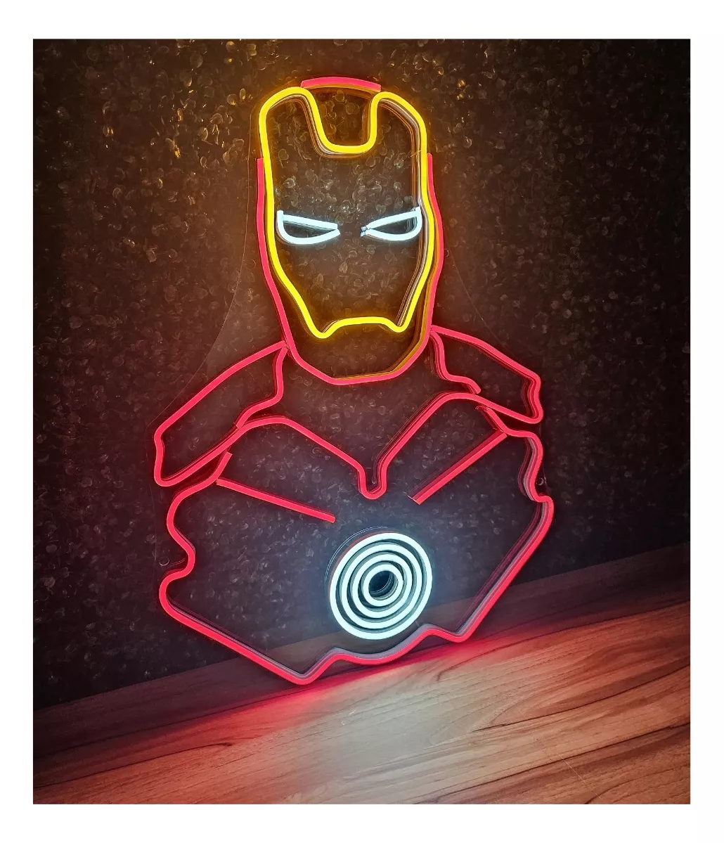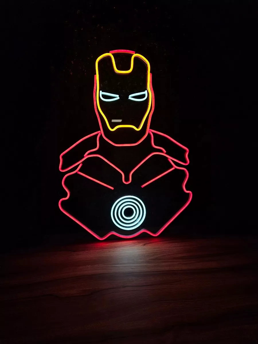 لوحة نيون فنية بتصميم أيقوني لشخصية Iron Man، مثالية لمحبي مارفل وعشاق الأبطال الخارقين.