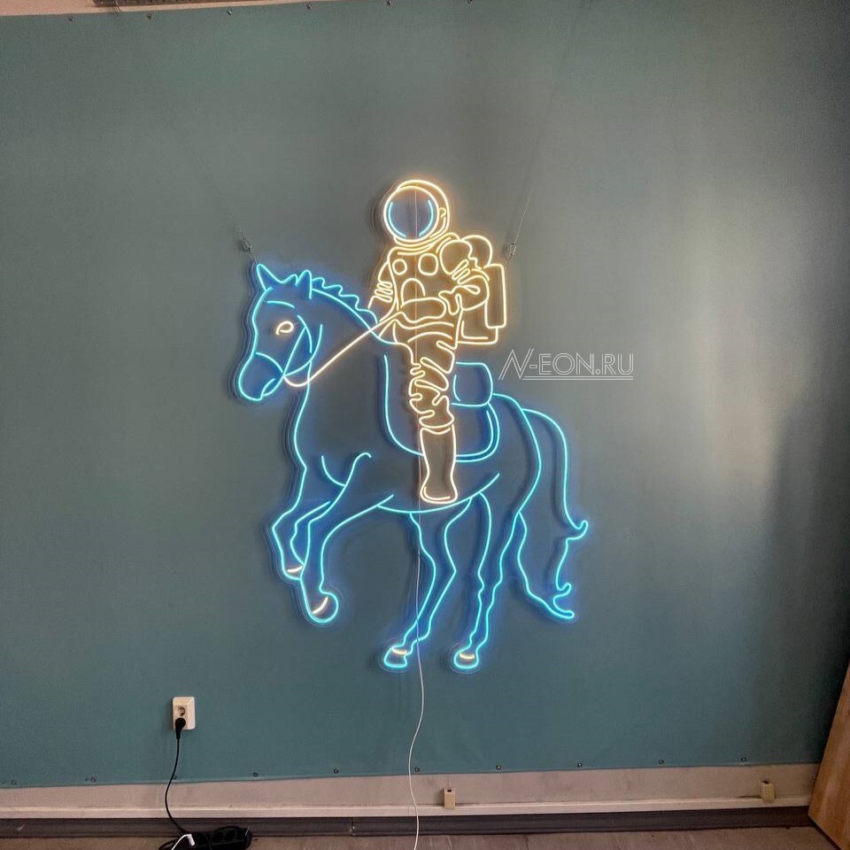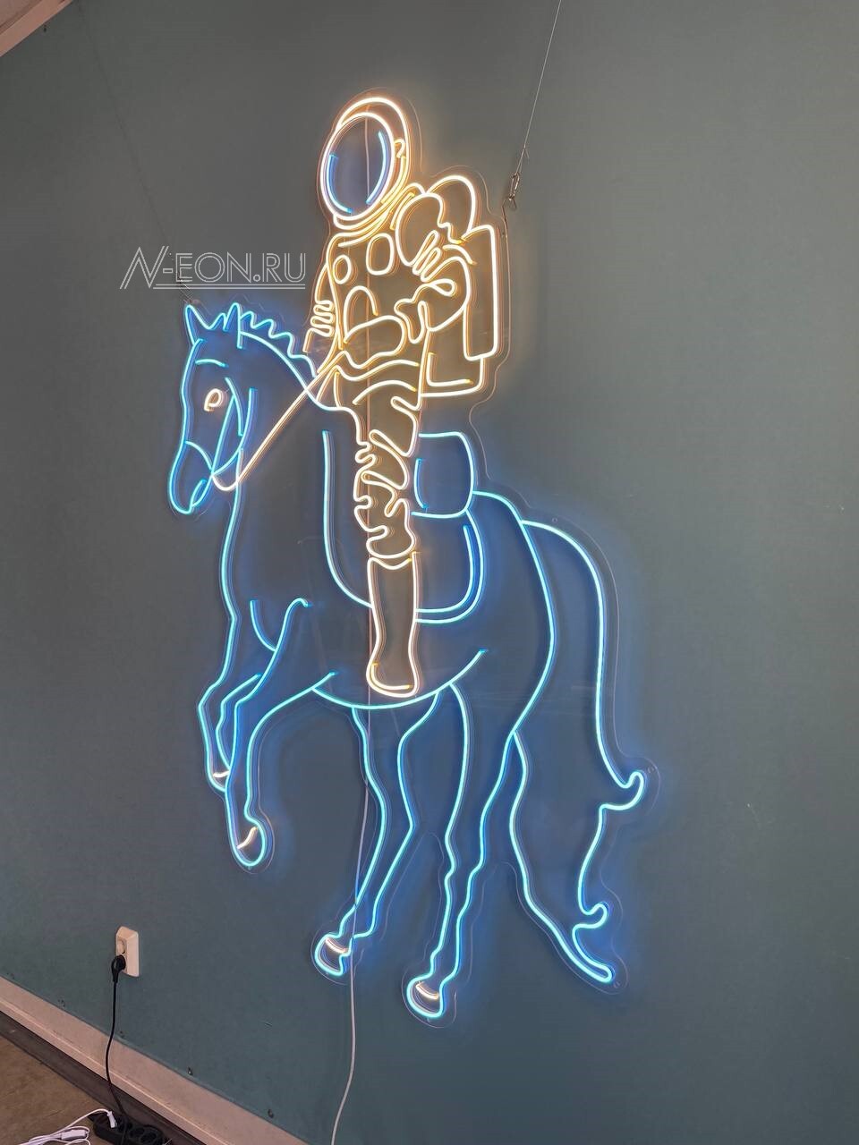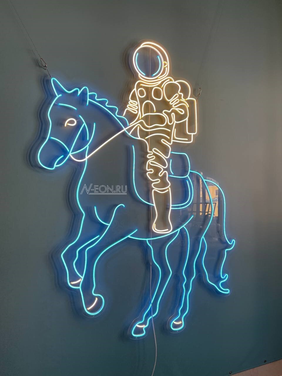 قطعة فنية مميزة راح تبهر الكل! رائد فضاء على حصان – فكرة جريئة ومبتكرة لديكور بيتك. إضاءة نيون قوية وتصميم مو عادي راح يجذب انتباه الضيوف.