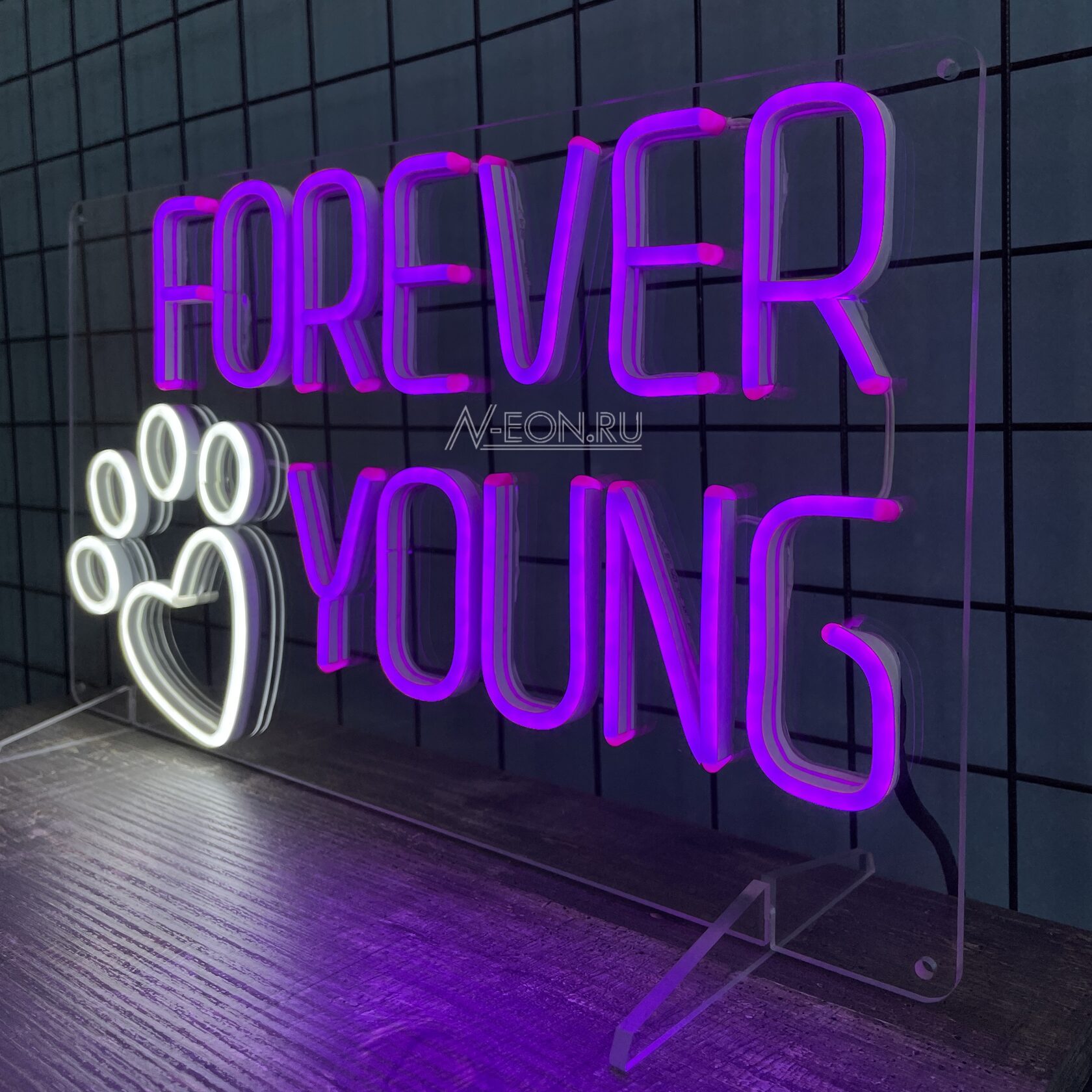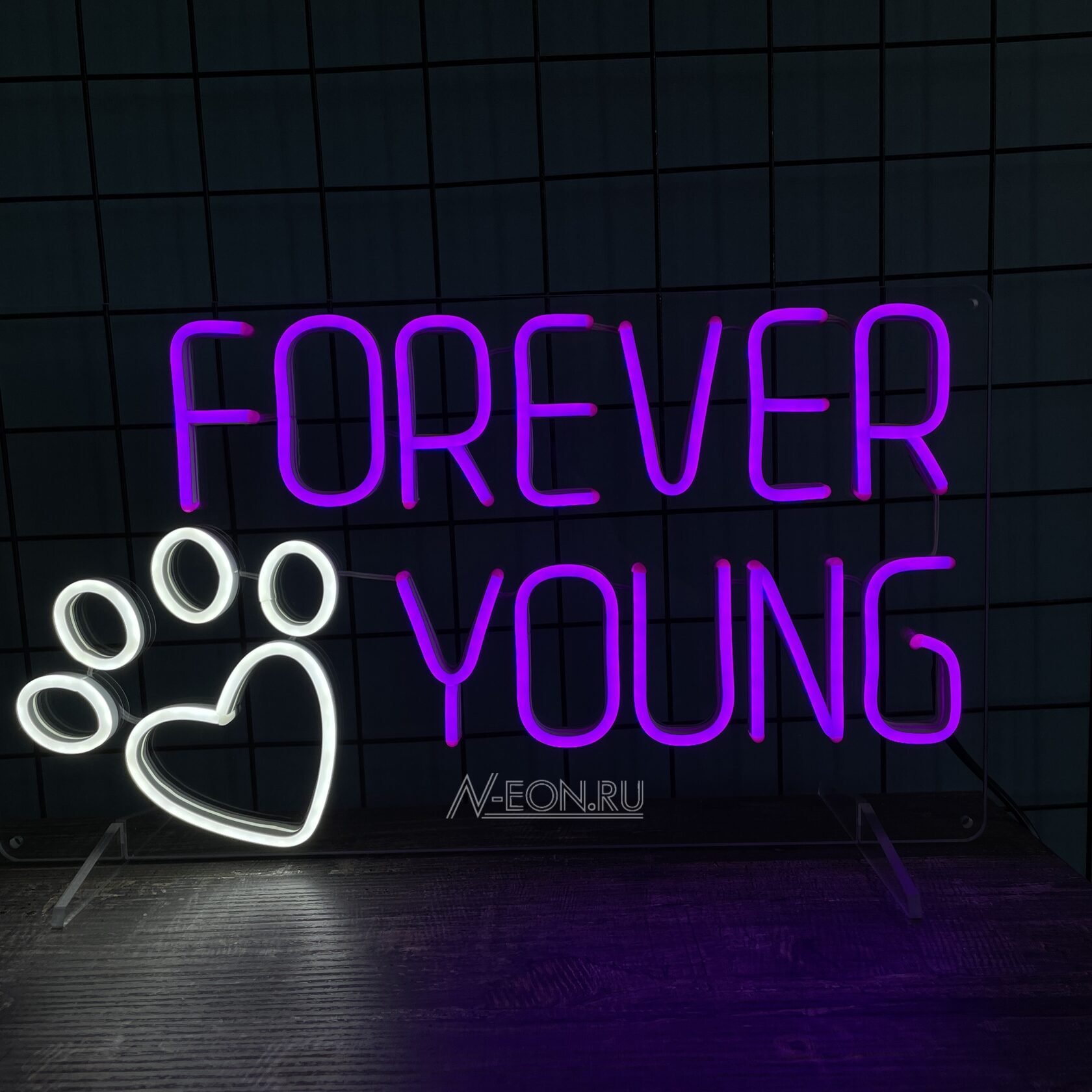 ✨ لافتة نيون “Forever Young” وياها طبعة مخلب حلوة، مثالية تماماً لصالونات الحيوانات الأليفة أو استوديوهات الحلاقة. راح تخلق جو مال اهتمام وحب للحيوانات الأليفة، وتأكد إن هنا يساعدون الحيوانات تبين وتحس بنفسها تجنن. ???? لافتة نيون لصالون الحيوانات، حلاقة، وديكور راقي لاستوديو Pets.